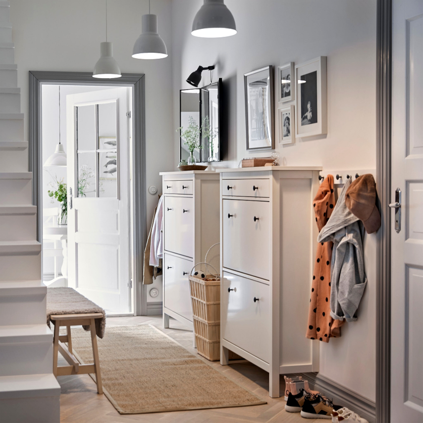 Важно продумать и место для хранения обуви, это небольшие обувницы, этажерки