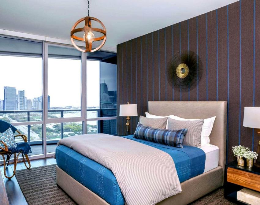 Что касается отделки стен спальни площадью 12 кв.м., не стоит применять большие рисунки на стенах. Крупные орнаменты уменьшают пространство. Из материалов отделки лучше выбрать обои, они наполнят помещение уютом и теплотой. Флизелиновые обои – это идеальное решение для ремонта. Они имеют плотную фактуру, благодаря которой скроют любые неровности и трещины на стенах. Они экологичны, легко клеятся и хорошо стыкуются, что значительно облегчит ремонт комнаты. Можно выбрать акцентную стену напротив кровати или у изголовья кровати и оклеить ее обоями с ярким узором, как на фото.