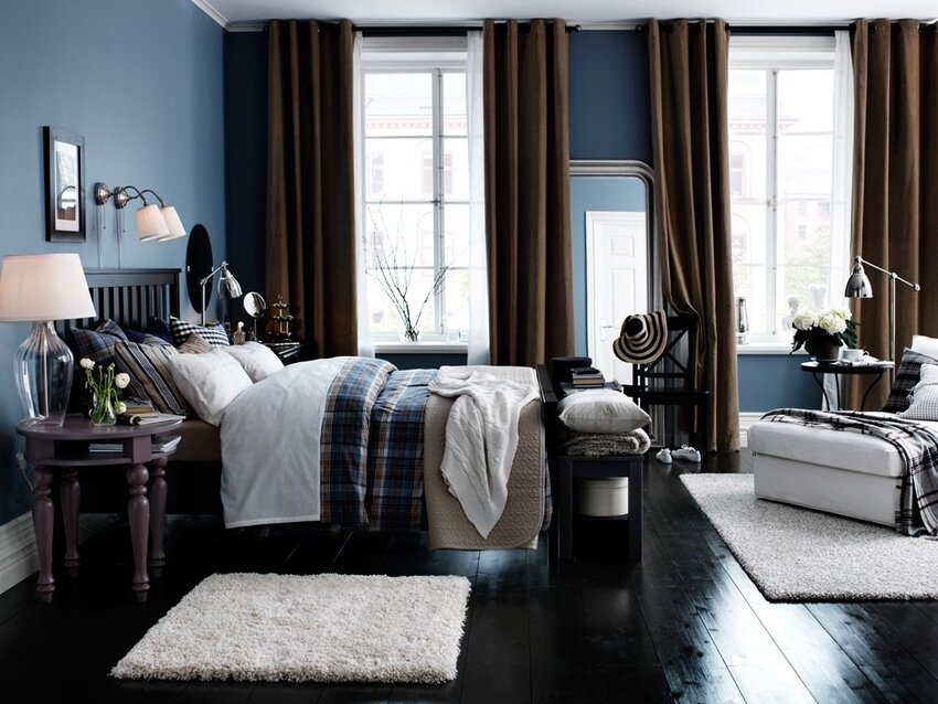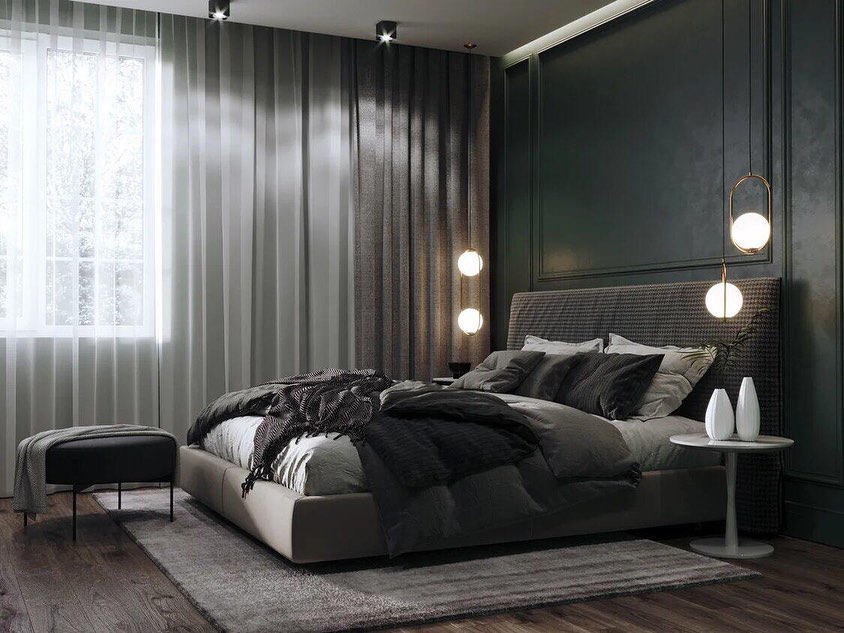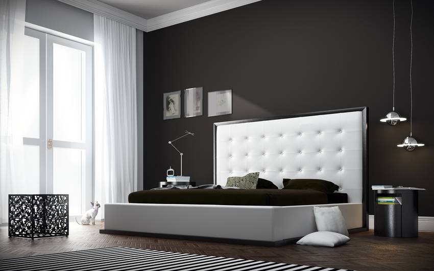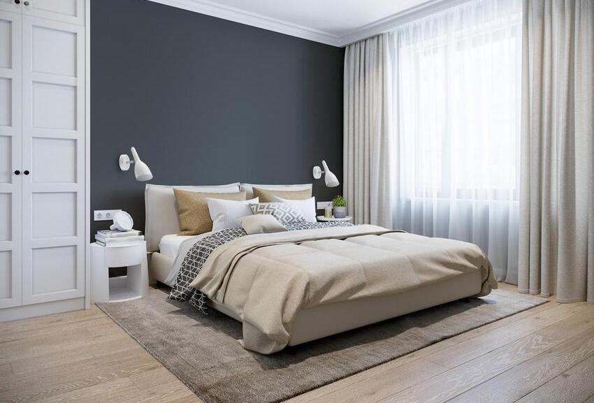 Если стены в спальне оформляются темными цветами, для пола и потолка следует предусмотреть светлую отделку. Это поможет разбавить однородность пространства, а в сочетании со светлым текстилем сделает его органичным и комфортным.