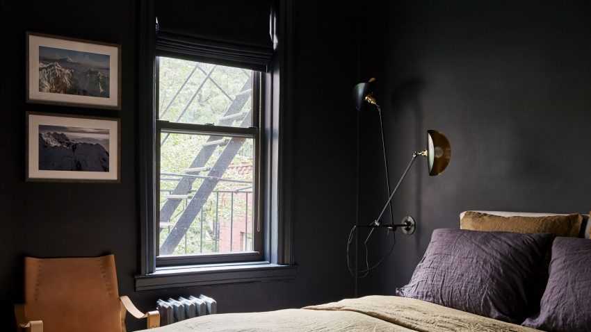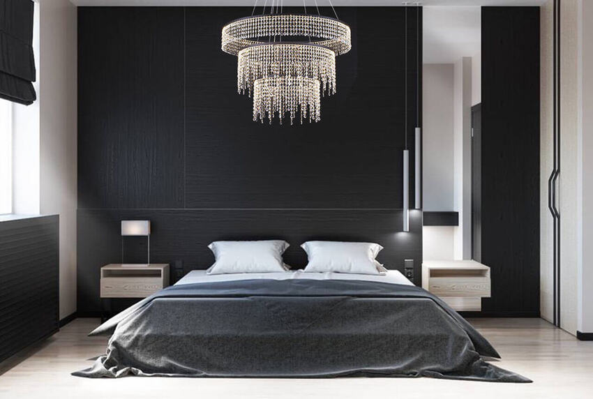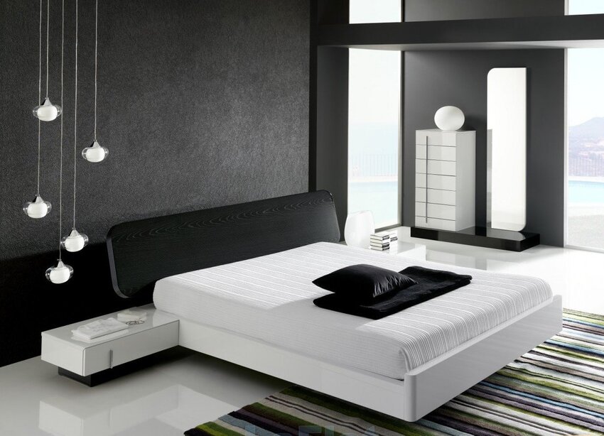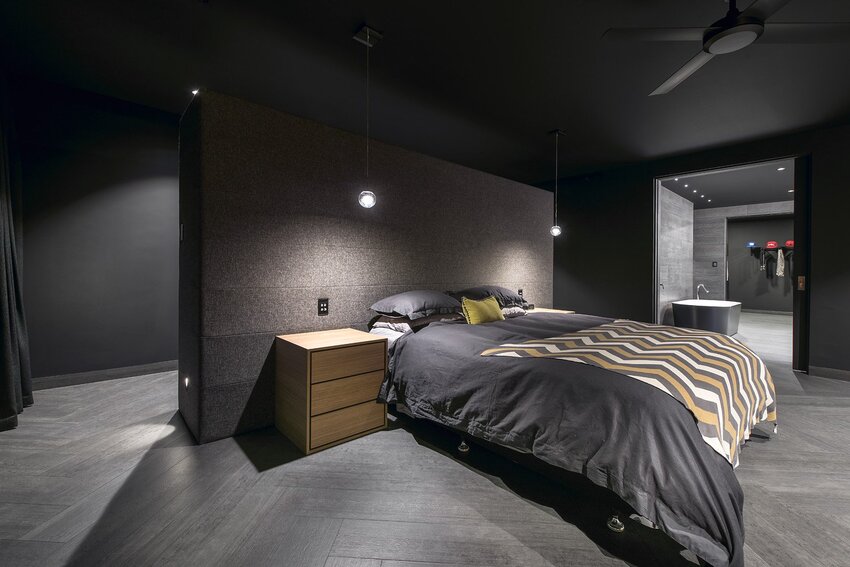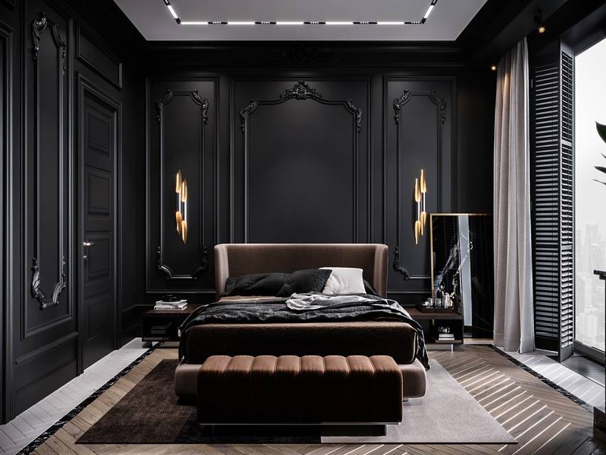 Темные тона при оформлении спальни помогают сделать атмосферу более интимной и уединенной. Обычно для этого используется черный, темно-серый, синий, фиолетовый и т.д.