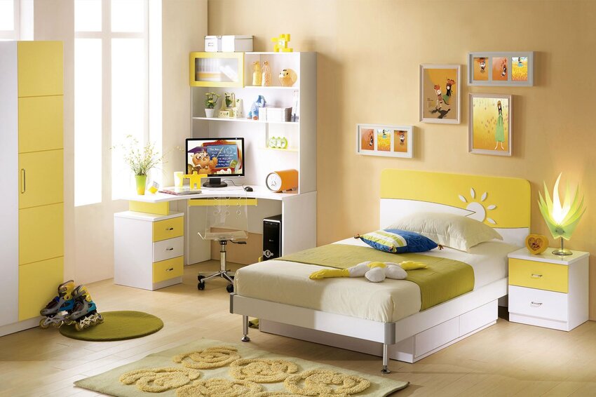 Модуль для хранения одежды, канцелярии и книг, письменный стол, диван – это самый необходимый набор мебели для маленькой стильной комнаты. Желтый стул, повторяющий яркий цвет автомобиля на картине, — удачная изюминка, разгоняющая скуку.