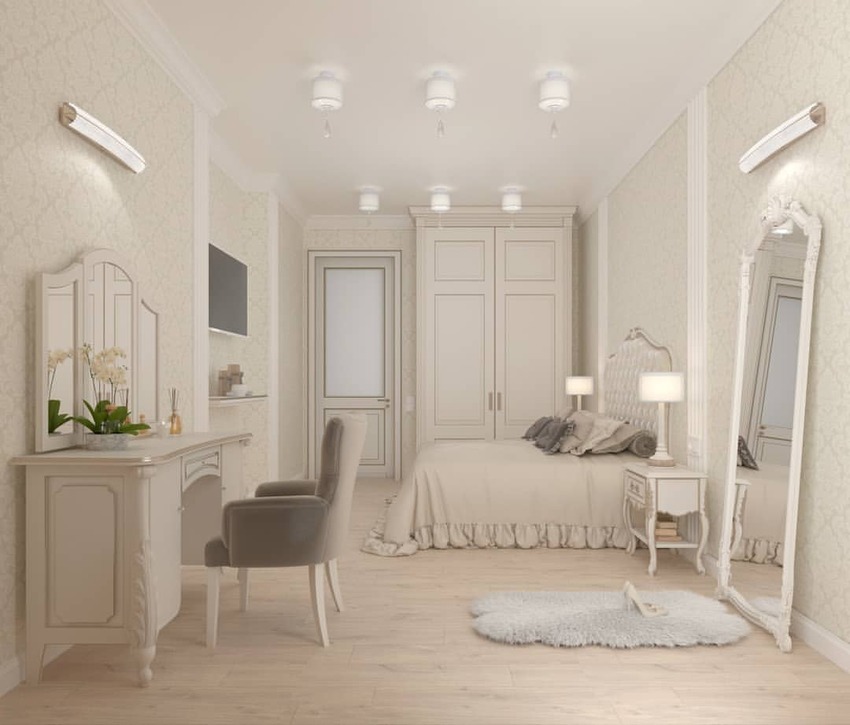 - Если есть необходимость в шкафах и комодах для одежды, оптимально выбрать стену или нишу для встроенной мебели. Фасады же при этом будут соответствовать выбранному стилю. В любом направлении дизайна можно найти полотна с зеркальными вставками, которые помогут зрительно расширить пространство.