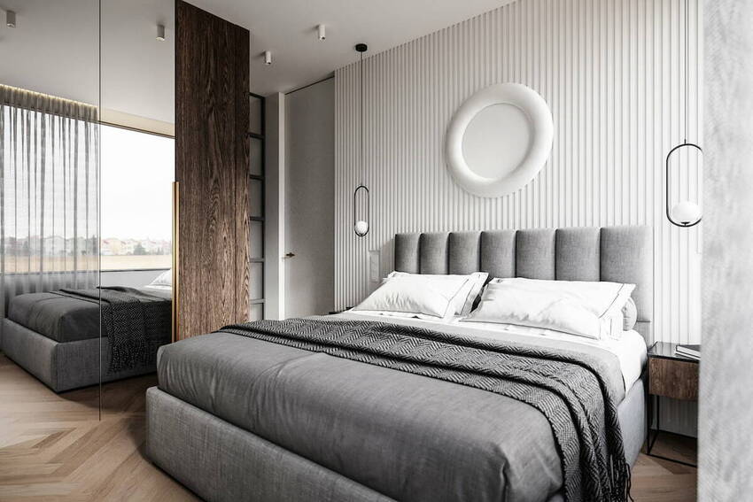 Для спальни площадью 15 кв м нет четких цветовых ограничений — если вы хотите, чтобы комната казалась еще более просторной, используйте более светлые тона. Также необходимо учитывать концепцию стиля, в котором оформлена спальня. В современном интерьере очень популярны белые и светло-серые тона, позволяющие создать нейтральную и минималистичную атмосферу, в которую гармонично впишется любая другая цветовая гамма.