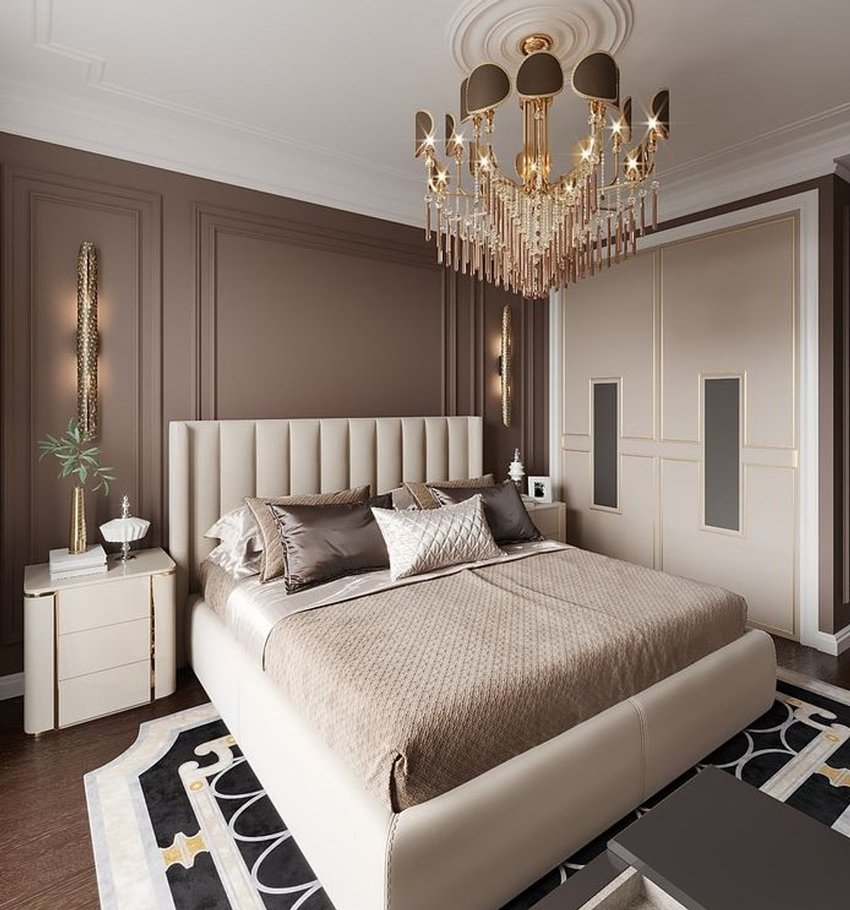 Чтобы спальня не казалась чрезмерно мрачной и создавала ощущение камерной обстановки, следует разбавлять темные тона белым и другими светлыми оттенками. Например, с этой задачей хорошо справляется бежевый, молочный, кремовый, желтый.