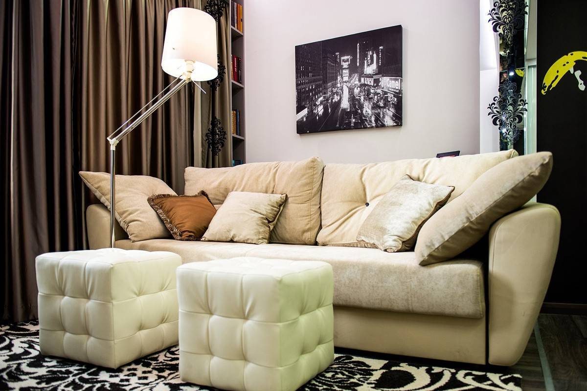 Среди декора, который можно использовать в столь малом помещении, повседневные предметы – шторы, текстиль на диване, светильники, вазы, малые формы мебели, например, пуфики, журнальные столики.