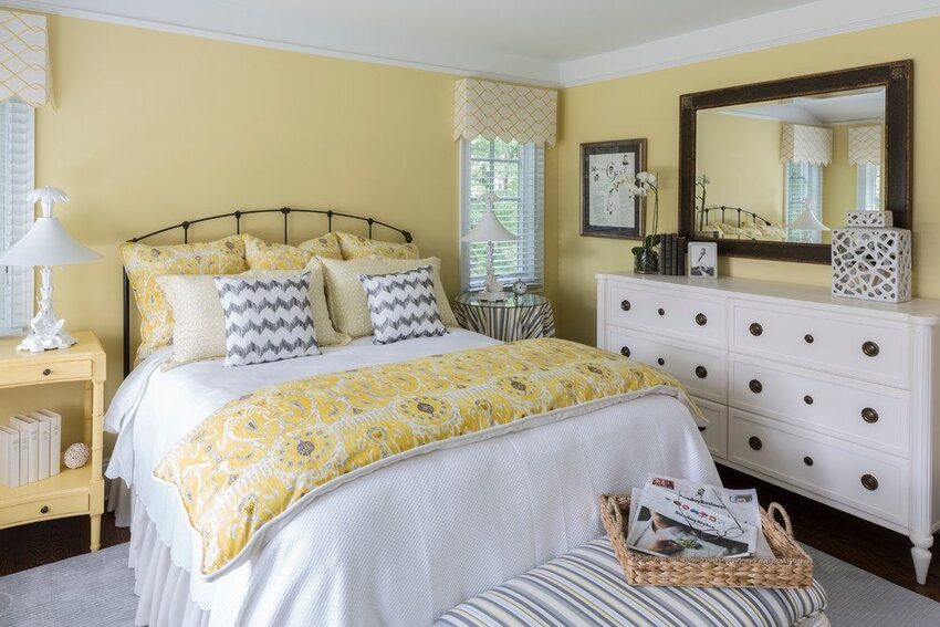 Добавление ярких вставок в светлой спальне поможет обеспечить зонирование пространства