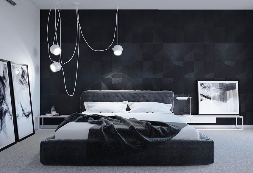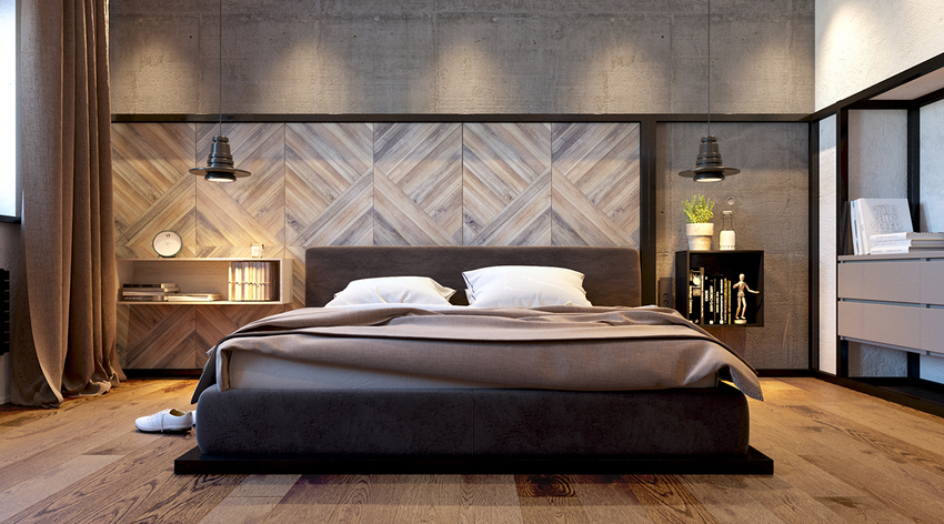 Мужская спальня обычно оформляется в темных тонах. Для её дизайна применяют такие стили как лофт, хай-тек, техно, минимализм, барокко, японский, шале. Декор не используется вовсе или по-минимуму.
