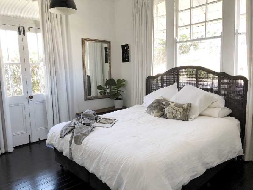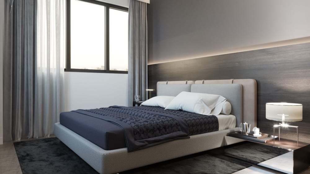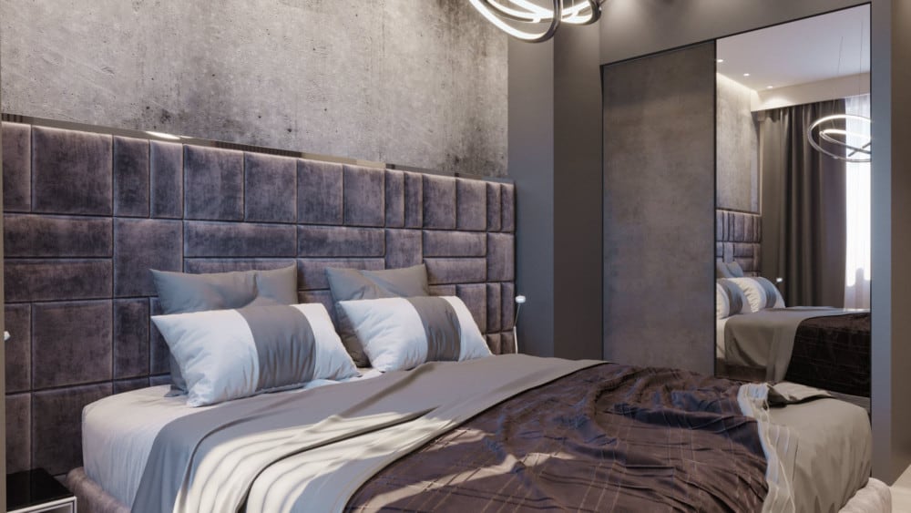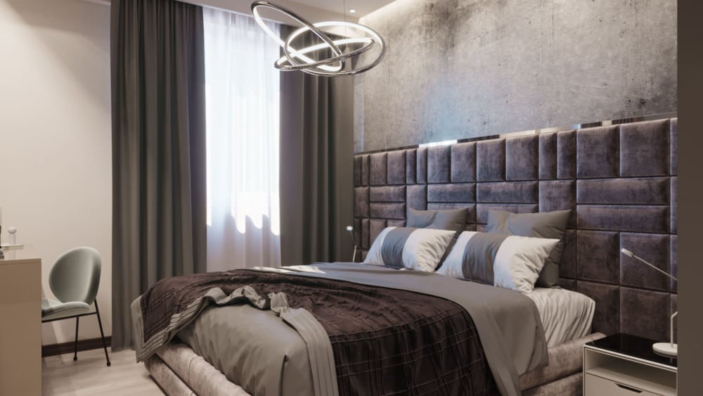 Предвкушая вопрос — нет, это не будет выглядеть неуютно. Это очень простое правило: отделка с прямоугольными правильными формами, смягчение и плавные линии за счёт текстиля, штор и мягкой мебели, которых в спальне хоть отбавляй.