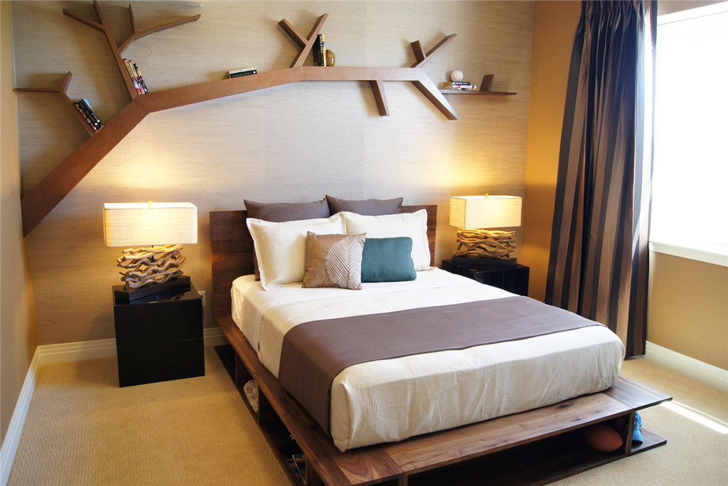 Разница уровней. Можно выстраивать сложные конструкции на потолке или полу. Самый эффективный прием в дизайне спальни — кровать-подиум. Поднимая кровать вы сразу обозначаете зону для сна, а на оставшемся пространстве можно разместить рабочий стол или гардеробный шкаф.