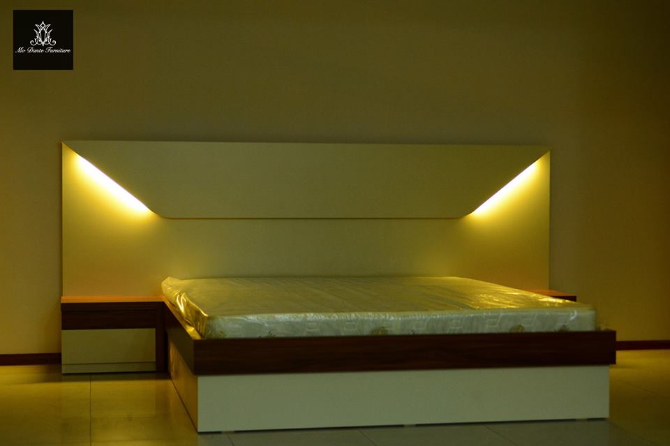Если хочется применить необычное решение, тогда кровать нужно поставить на подиум или с помощью специальных крепежей повесьте ее, а снизу установите подсветку.