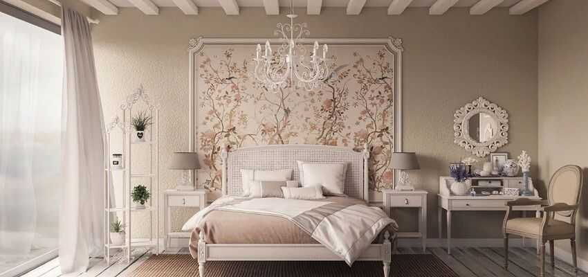 В таком стиле спальня смотрится очень шикарно и атмосферно, с наличием различных элементов декора и роскоши. Из цветовой гаммы хорошо подходят светлые пастельные тона.