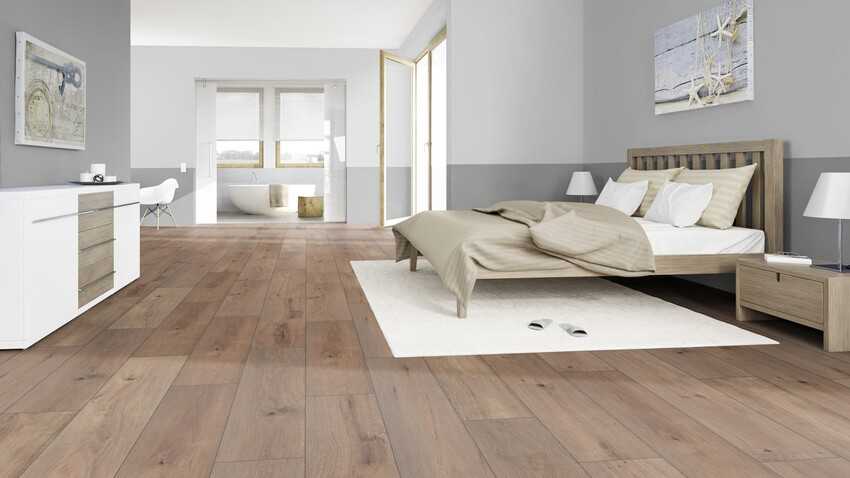 На пол в спальне без колебаний выбирай ламинат под дерево, без сложных изысков. Особенно популярны коллекции под грубые необработанные доски, серый дуб или венге. Камень или керамогранит слишком холодны и требуют теплого пола либо конвекторов, а настоящий паркет более капризен в монтаже и уходе.