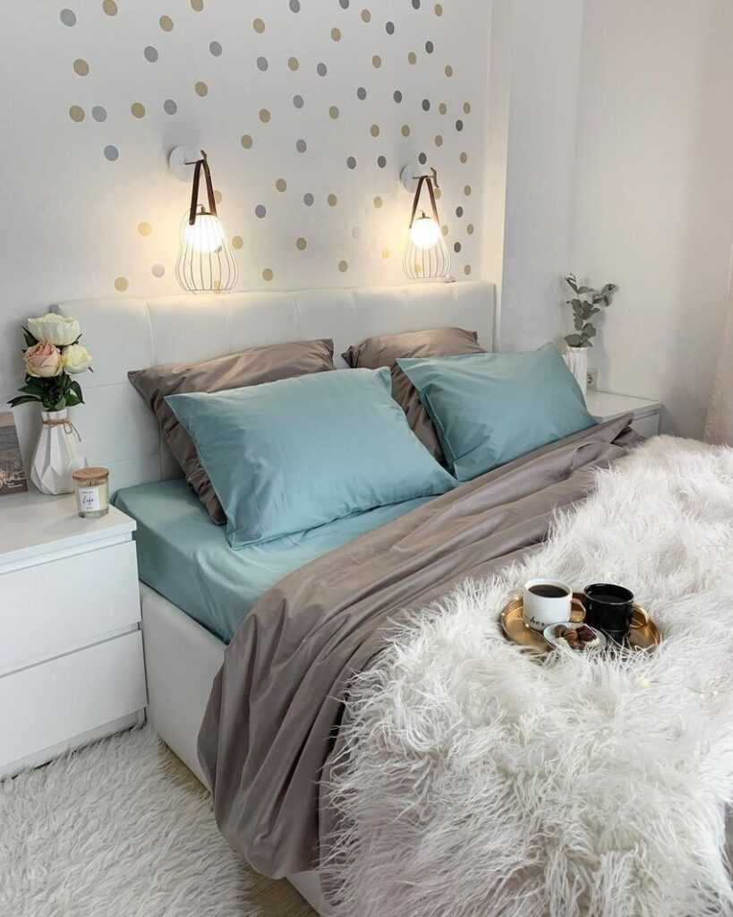 - Для маленькой спальни выбираются светлые, отражающие естественный свет, оттенки для стен. Оптимально, если они будут приглушенные, без ярких принтов. В спальне, выходящей на южную или солнечную сторону дома, лучше использовать холодную палитру, так как она создает ощущение прохлады (например, серую, голубую, фиолетовую). Для северной, холодной стороны подойдут теплые оттенки, они внесут в дом уют и солнечное тепло (розовый, бежевый, персиковый).