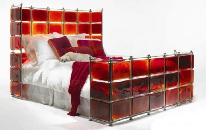 Кровать, оформленная цветным стеклом, напоминает ложе спящей красавицы. Мягкий высокий матрас и обилие подушек позволяют почувствовать себя уютно. Однако этот экземпляр скорее, выставочный, использование стекла в изголовье для ежедневной эксплуатации может быть опасно.