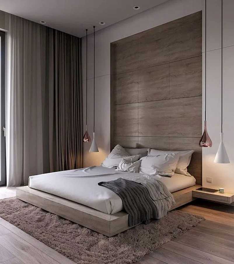 Стена за изголовьем часто делается акцентной – оставь кирпичную кладку, бетон или обшей ее деревянными панелями. Фотообои в современных интерьерах не слишком распространены. Если хочешь цветовой акцент – возьми темно-коричневую или темно-серую краску.
