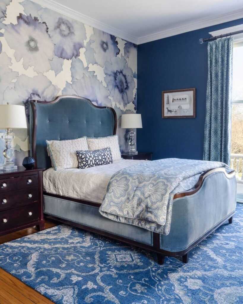2. Изголовье и стена одного цвета, но разной насыщенности. Например, темно-серая кровать рядом со светло-серой стеной, синяя кровать рядом с синей и т.д.