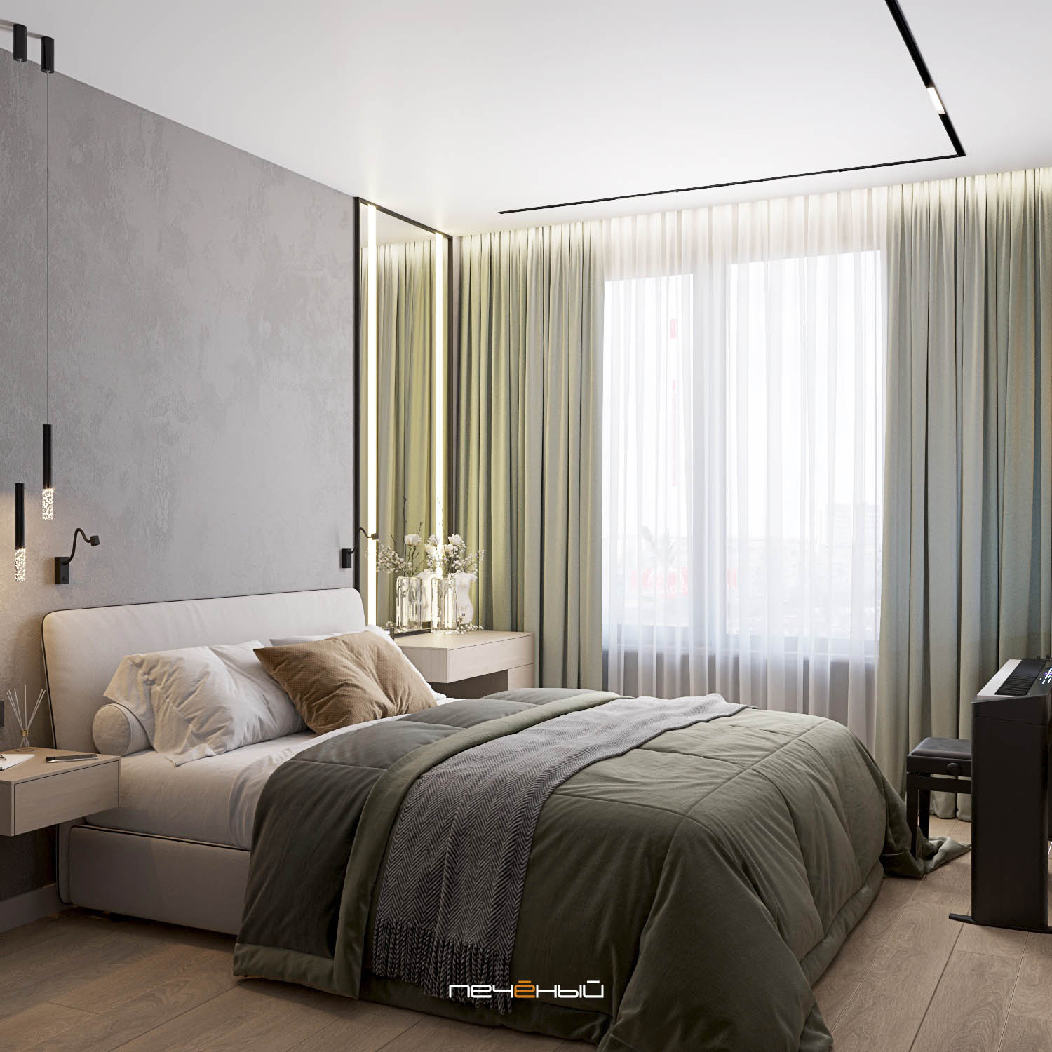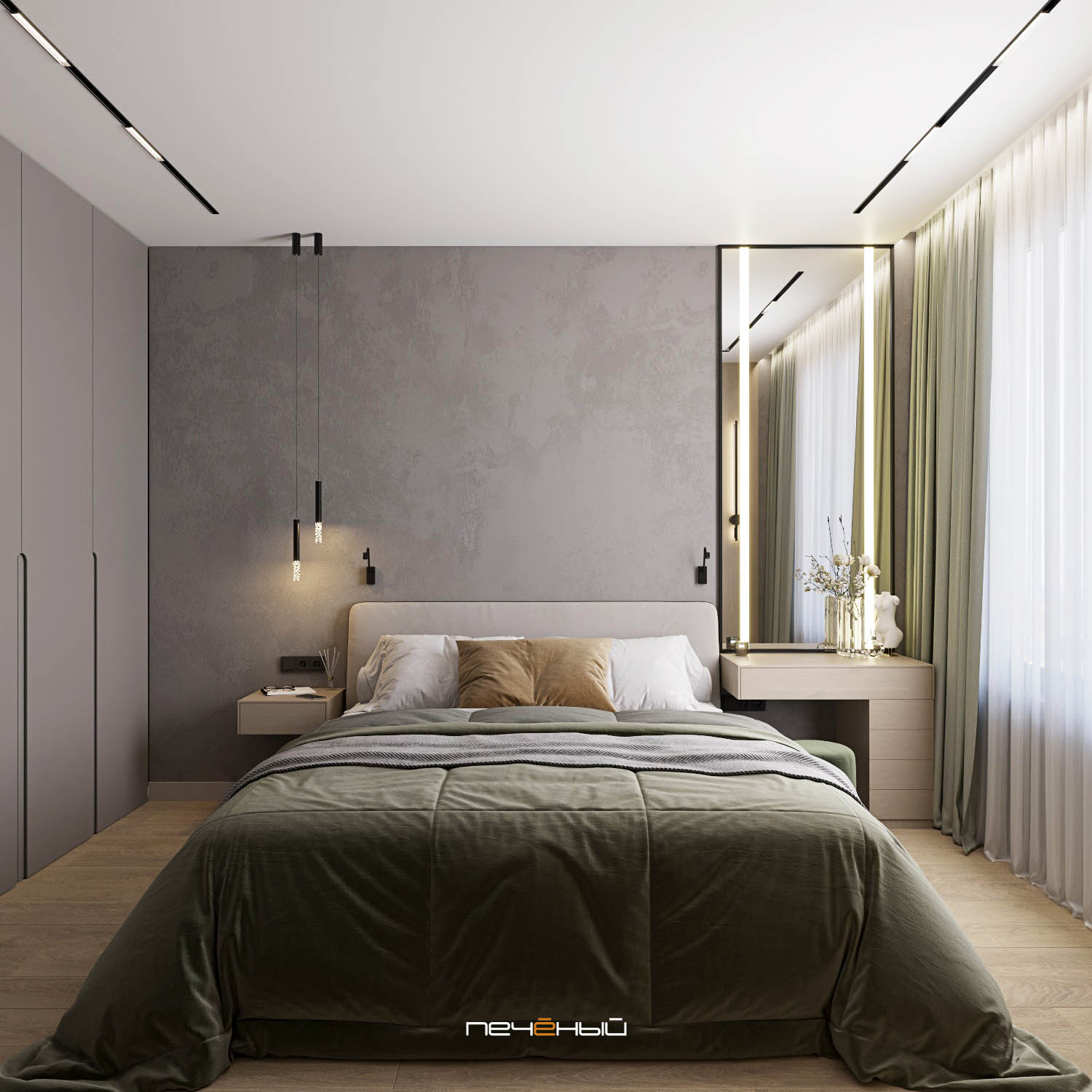 Здесь использовали такой брутальный приём, как «стены под бетон», тем не менее, эта спальня вовсе не смотрится чисто мужской. А ещё в этом интерьере удалось почти спрятать огромный шкаф, благодаря тому, что его фасады почти полностью сливаются с цветом стен.
