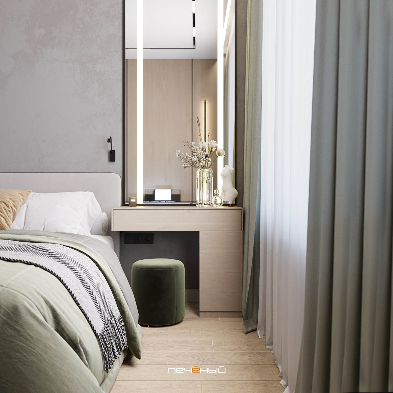 Различные оттенки зелёного можно сочетать практически в равных пропорциях с серым — в любом варианте спальня порадует атмосферой спокойствия и умиротворения.