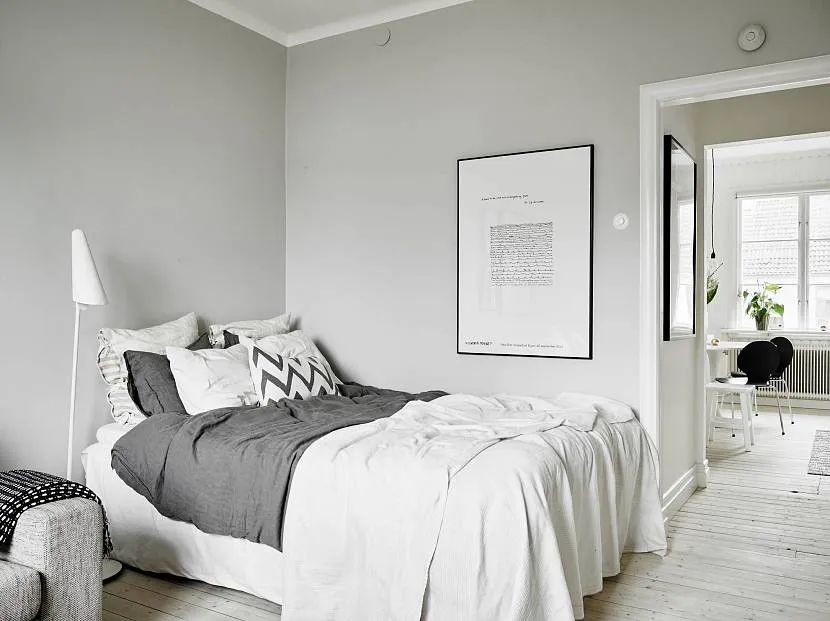 Для интерьера комнаты хорошо использовать светлые оттенки серого в качестве основного цвета и синие акценты, чтобы сделать атмосферу спальни глубокой и привлекательной.