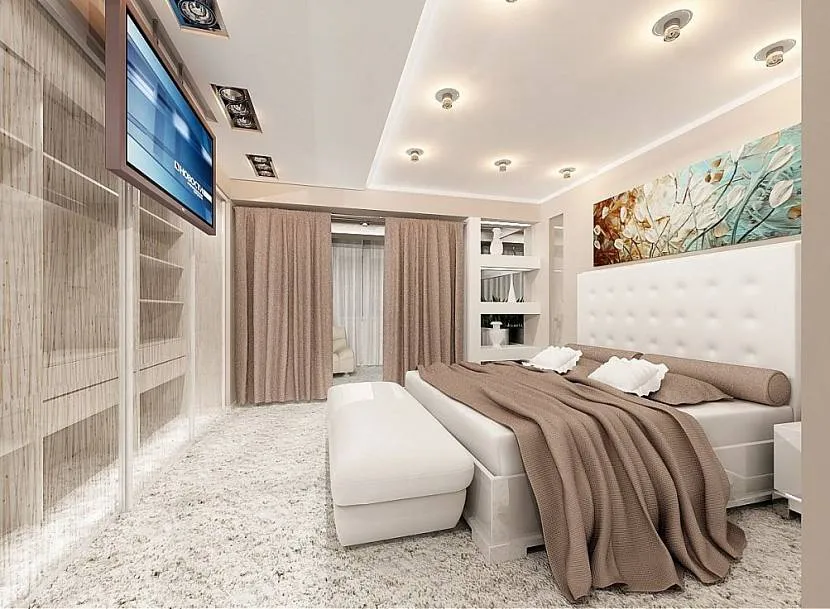 Для современного интерьера спальни в светлых тонах характерен минимальный декор, четкость линий в дизайне отделки и конструкции мебели, а также использование современных источников света. Кровать может быть классической или с бортиками, без изголовья. Здесь будет уместен шкаф-купе, открытые полки.