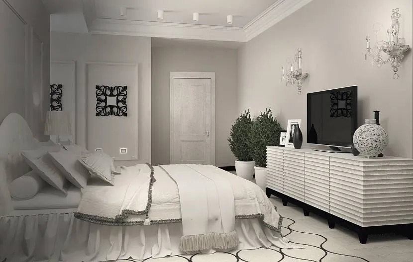- классический — роскошные люстры и картины в сочетании с белой кроватью подчеркнут безупречность вкуса хозяев дома;