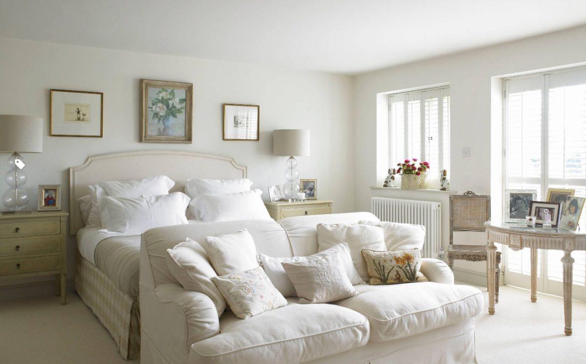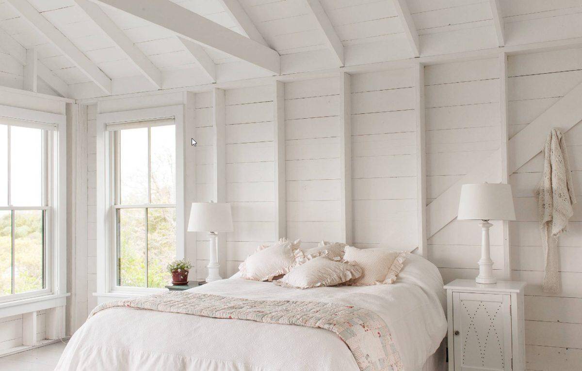 Однотонные цвета здесь неуместны, их нужно разбавить интересной палитрой, контрастом. Для этого в светлой спальне можно использовать плетеный ковер, антикварные часы, вязанное покрывало, картины и многое другое.
