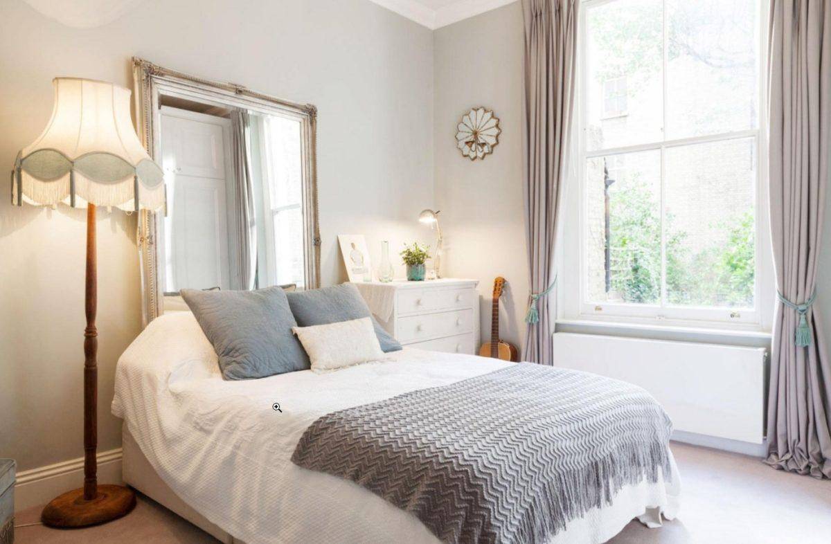 Чуть лучше, но всё равно не то. Вряд ли много смысла в попытках воскресить эту спальню — они пренебрегли всеми советами из этой статьи. Потолок не белый, фоновый цвет не нейтральный, так интерьеры не делаются. Белый неспроста так популярен