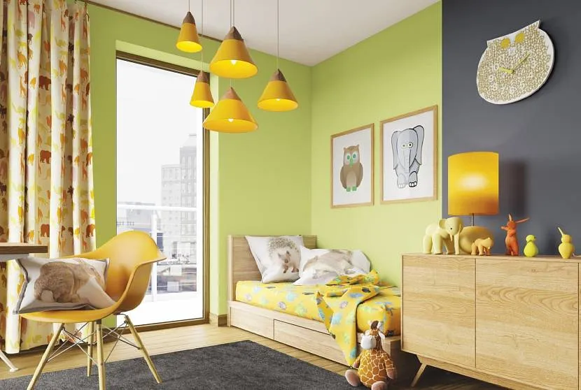 Желто-оливковый цвет стены детской разбавлен коричневым, желтым и серым Источник mebel-v-nsk.ru