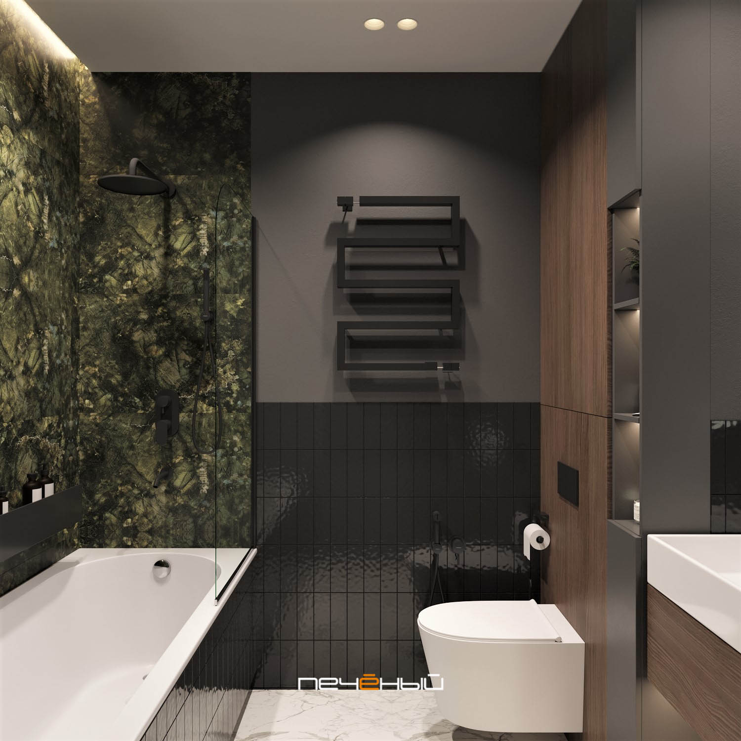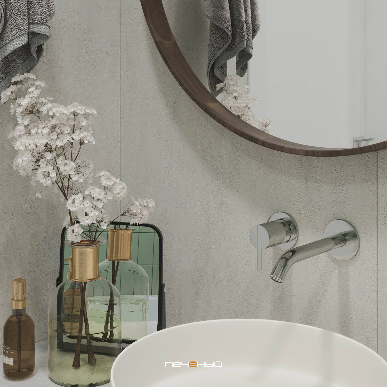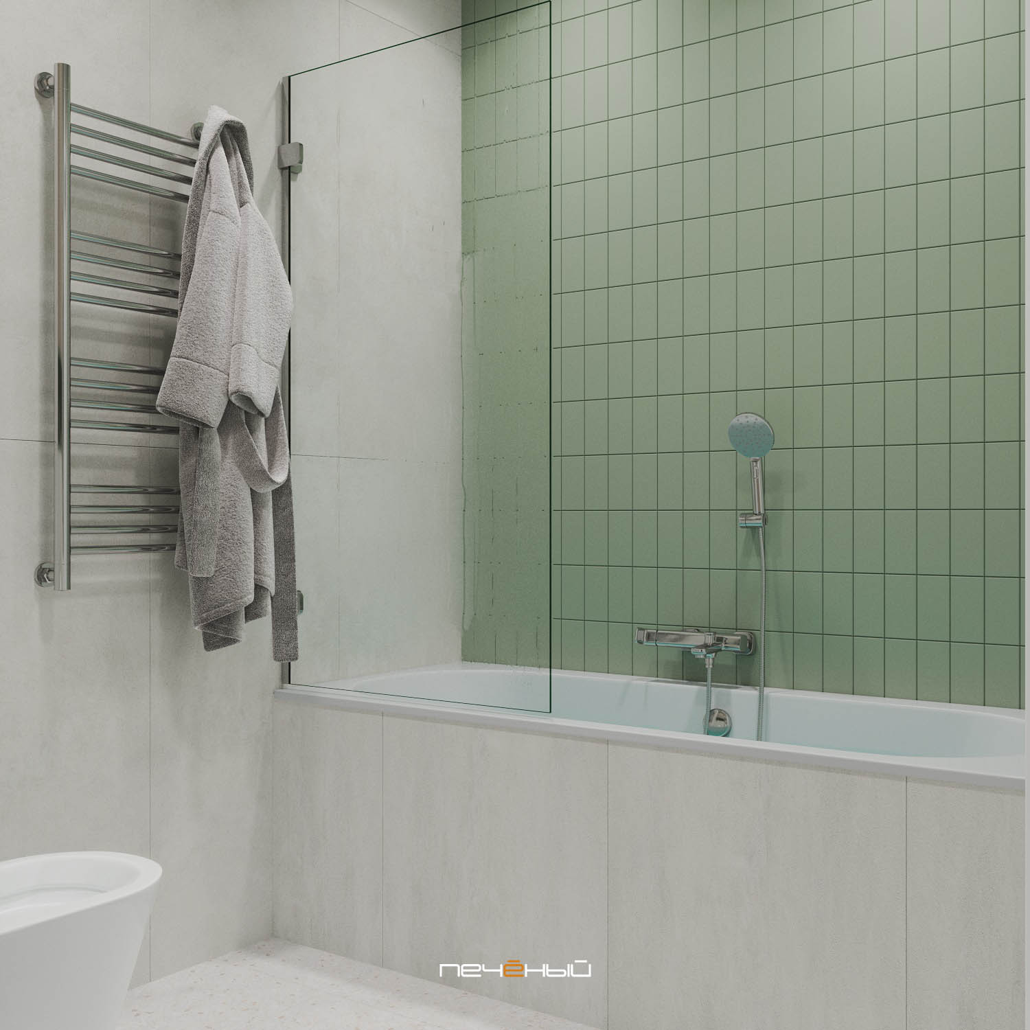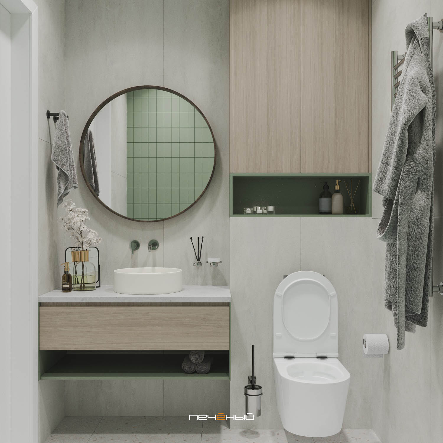 И завершает нашу подборку санузлов от студии «Печёный» вот этот милый вариант ванной комнаты в современном тиле с элементами сканди. Если вы хотите добавить какой-то цвет, но не хотите кричащих ярких оттенков, то светлый мятно-зелёный тон отлично подойдёт для этой цели. Вообще, синий и зелёный — это классика оформления ванных комнат, ведь это оттенки воды. Так что смело экспериментируйте — мы разрешаем. 🙂