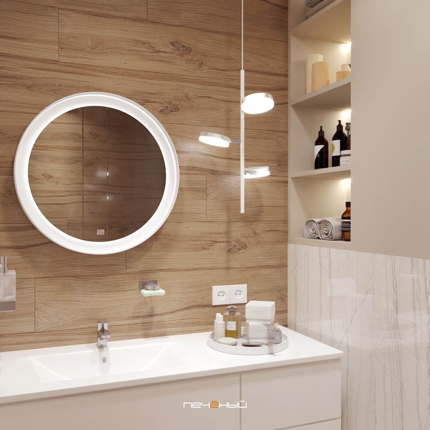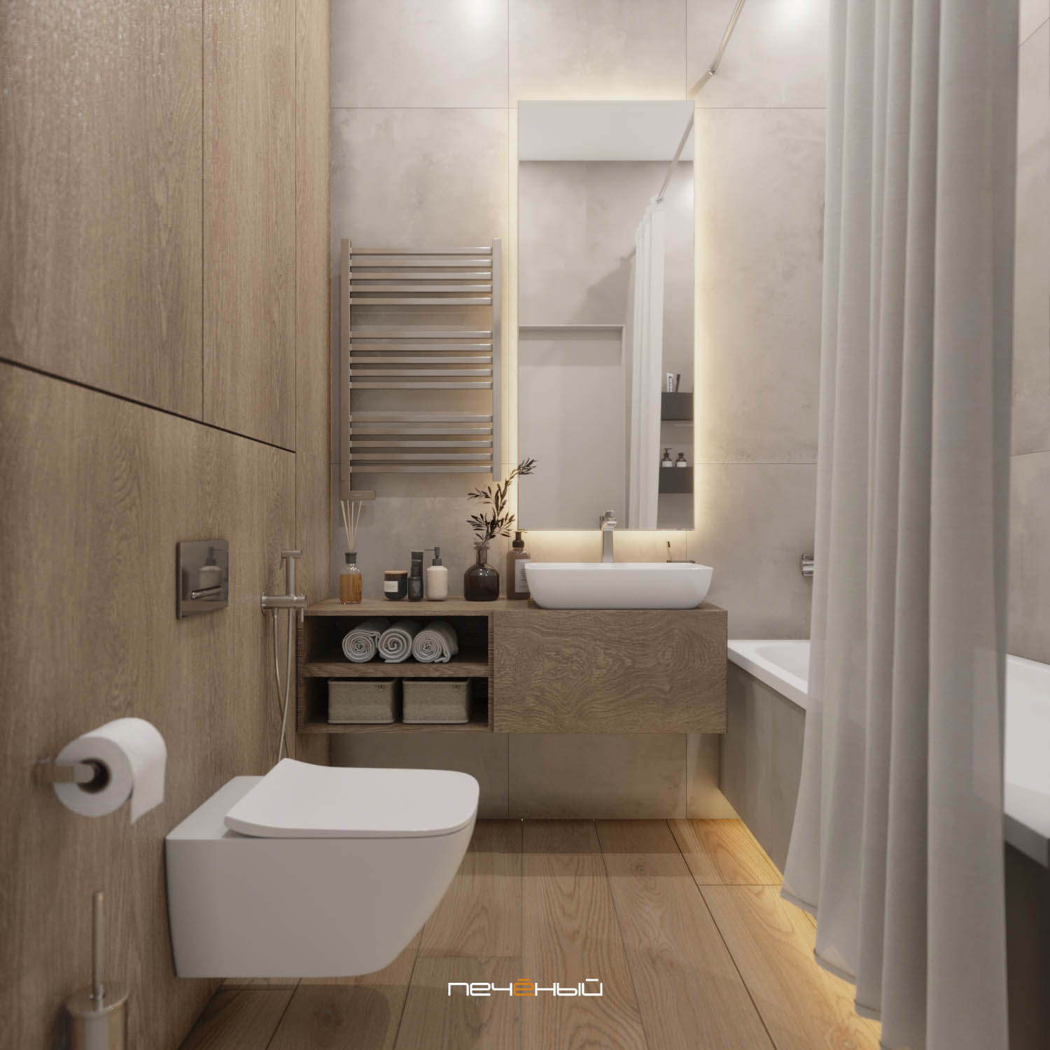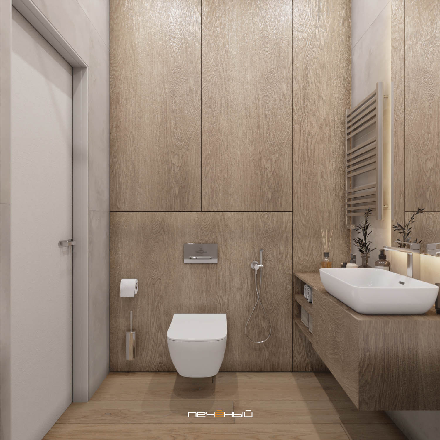 И завершает нашу подборку санузлов от студии «Печёный» вот этот милый вариант ванной комнаты в современном тиле с элементами сканди. Если вы хотите добавить какой-то цвет, но не хотите кричащих ярких оттенков, то светлый мятно-зелёный тон отлично подойдёт для этой цели. Вообще, синий и зелёный — это классика оформления ванных комнат, ведь это оттенки воды. Так что смело экспериментируйте — мы разрешаем. 🙂