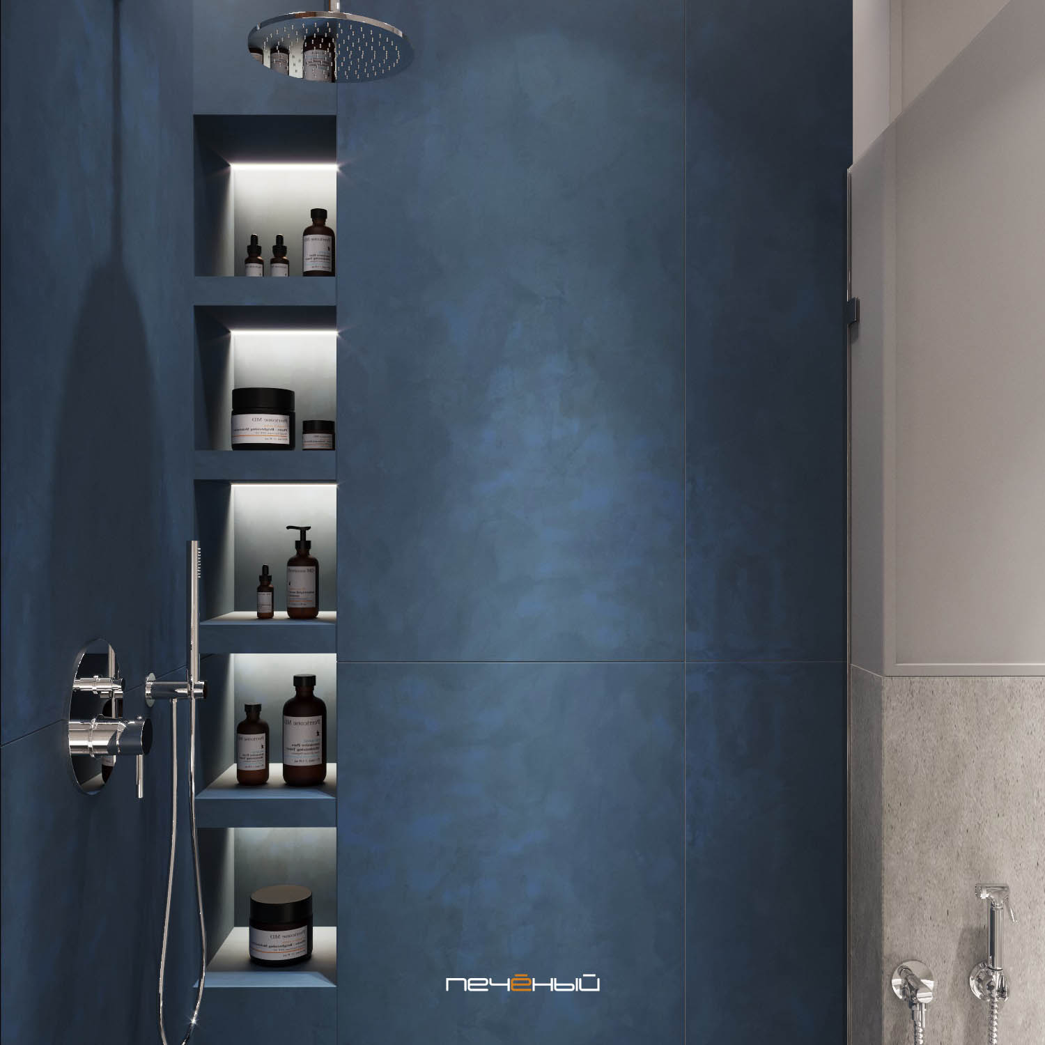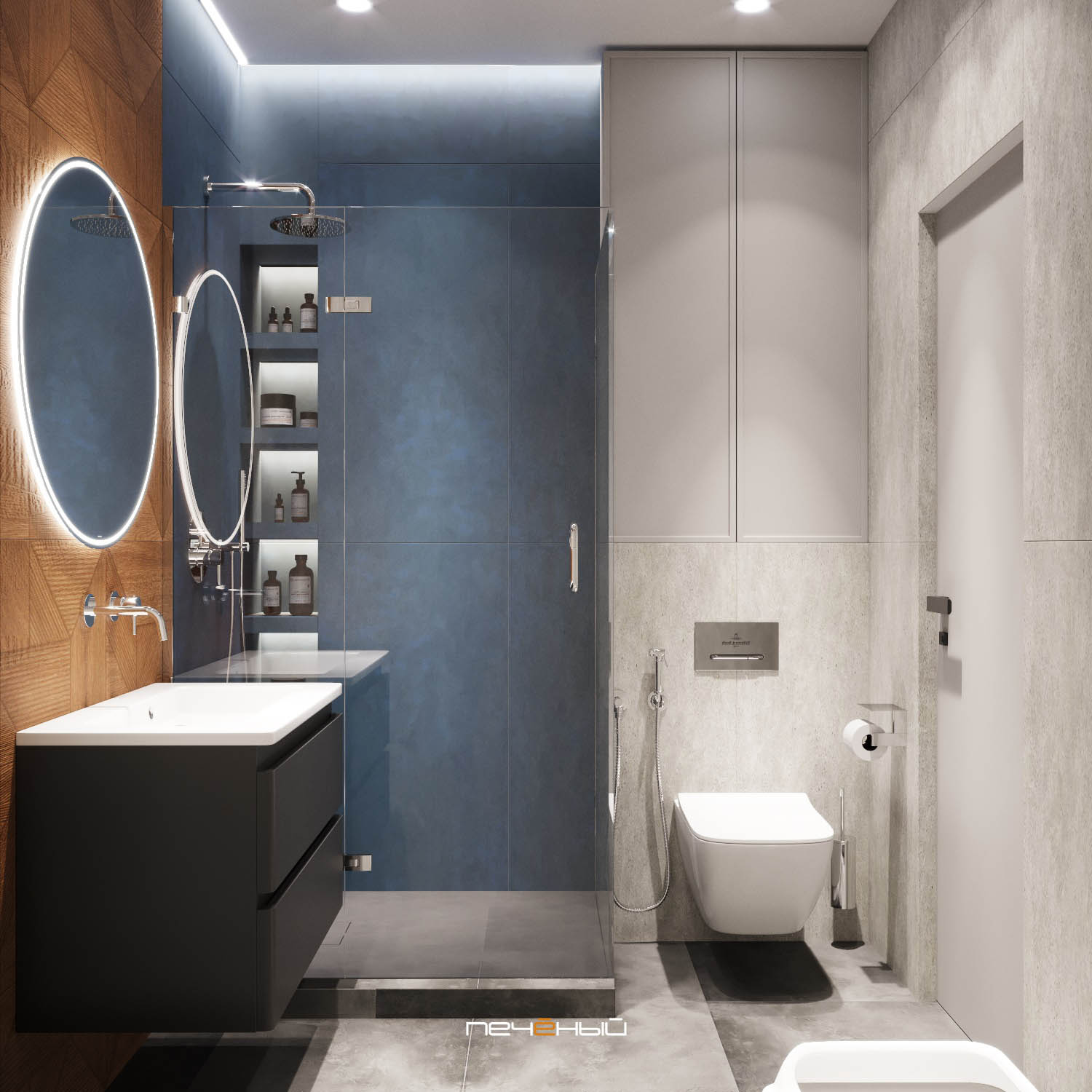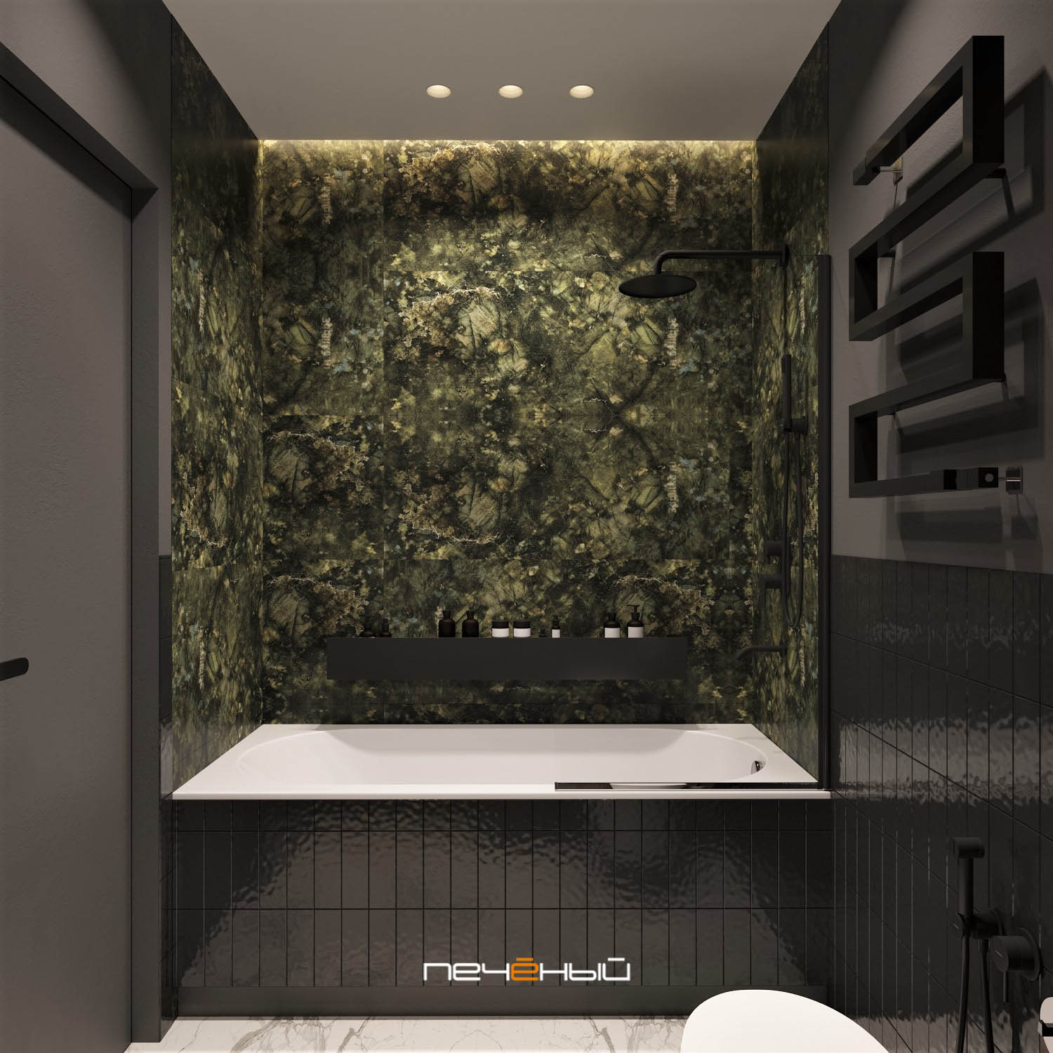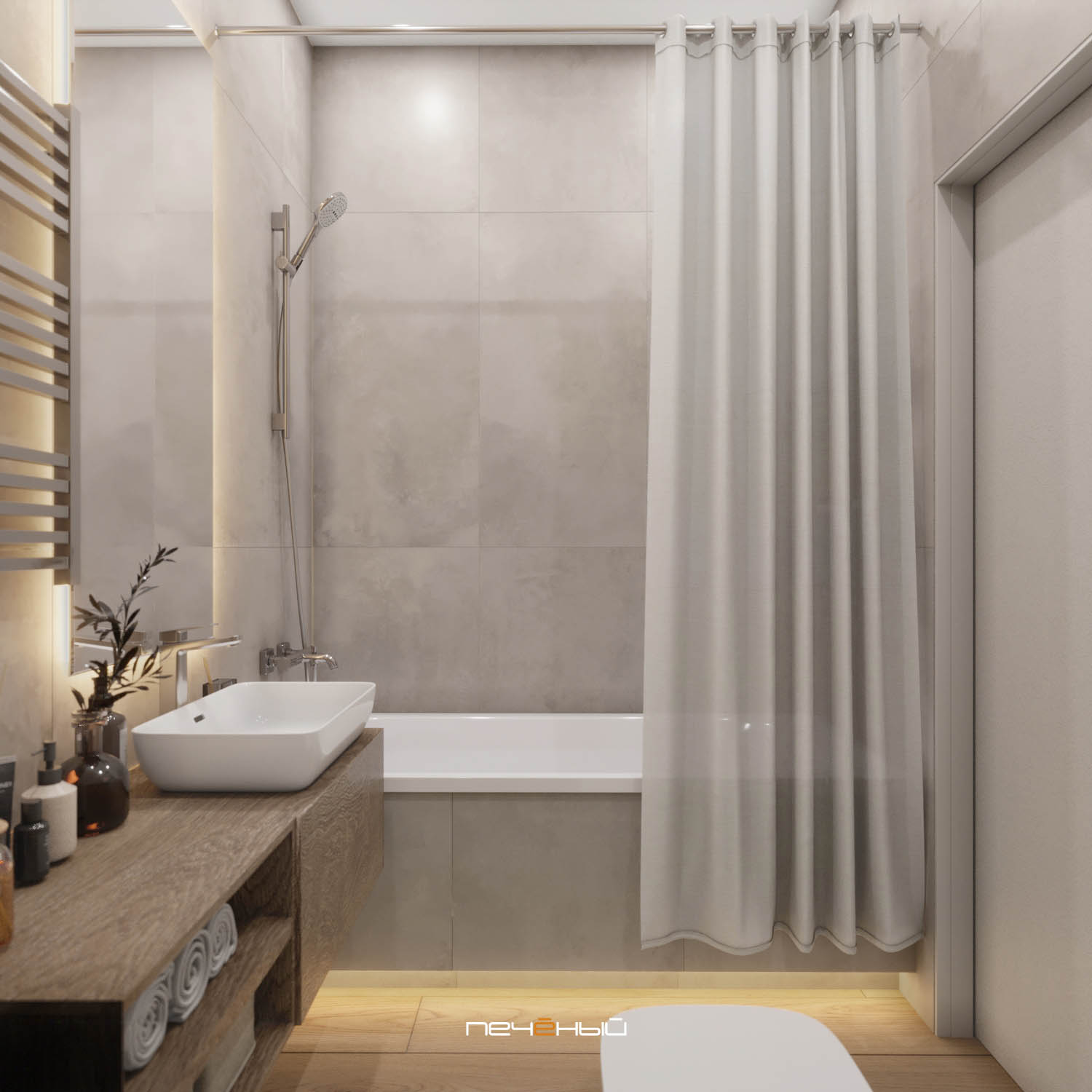 И завершает нашу подборку санузлов от студии «Печёный» вот этот милый вариант ванной комнаты в современном тиле с элементами сканди. Если вы хотите добавить какой-то цвет, но не хотите кричащих ярких оттенков, то светлый мятно-зелёный тон отлично подойдёт для этой цели. Вообще, синий и зелёный — это классика оформления ванных комнат, ведь это оттенки воды. Так что смело экспериментируйте — мы разрешаем. 🙂
