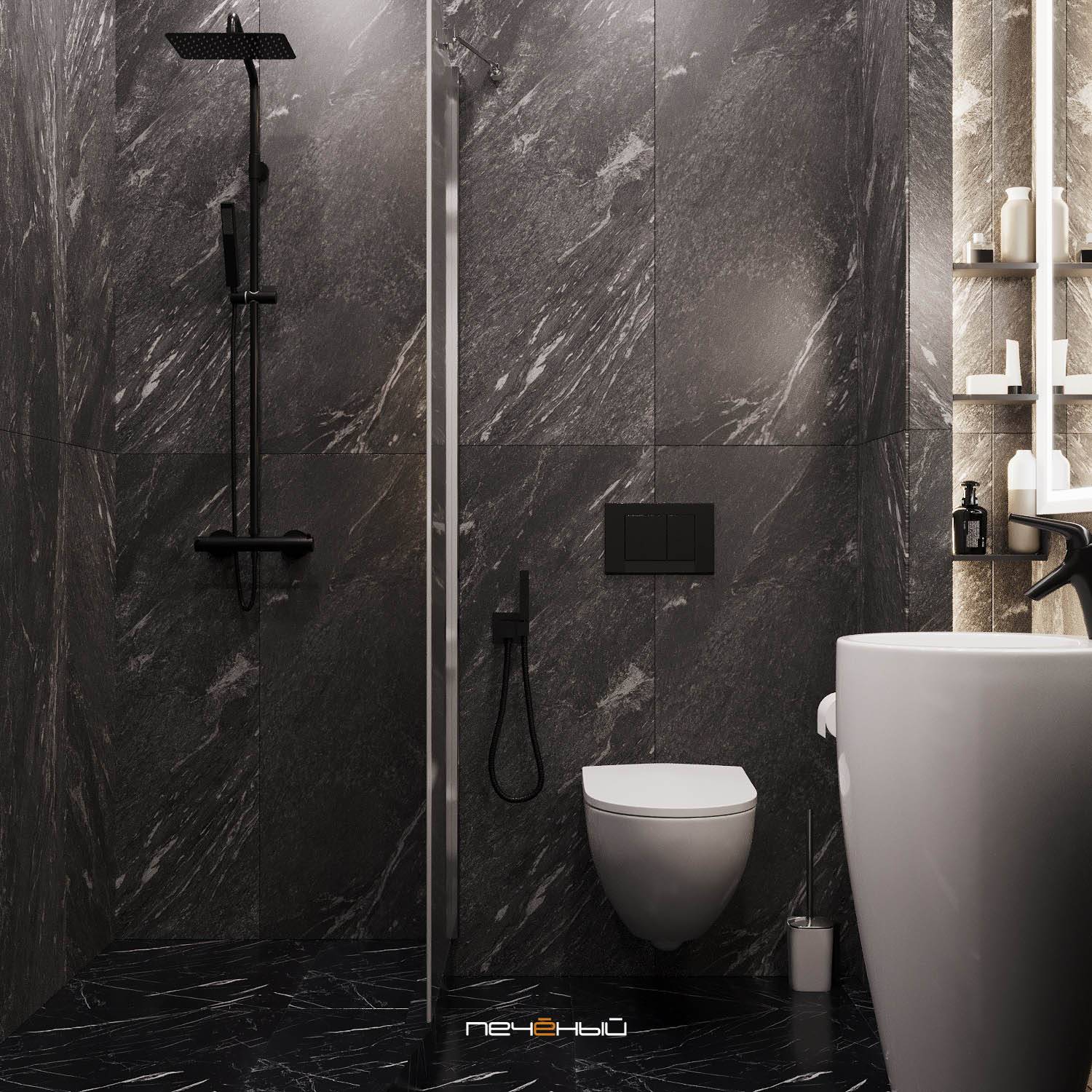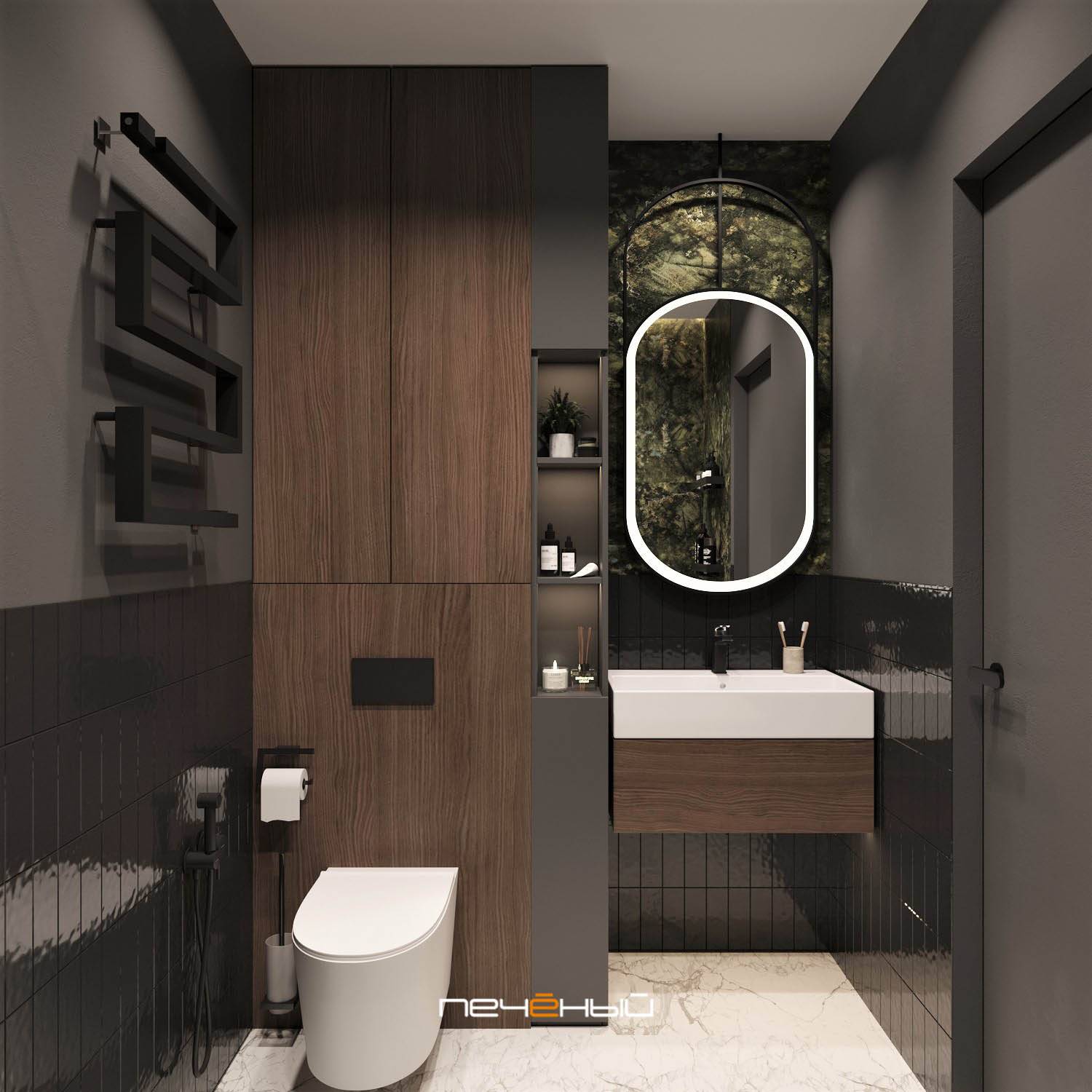 Как вам такой вариант санузла? Думаете, что это мужской брутальный санузел? Мог бы быть, верно. Но оформлялась эта ванная комната для молодой девушки — вот такой разрыв шаблона. 🙂