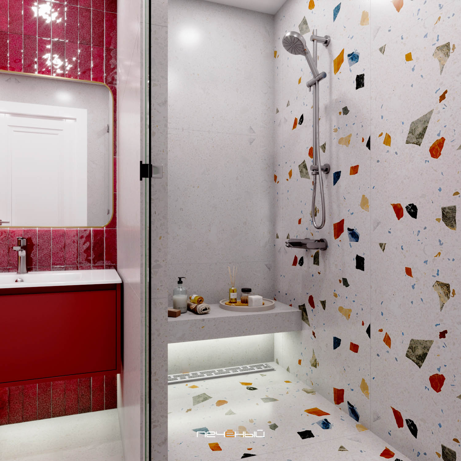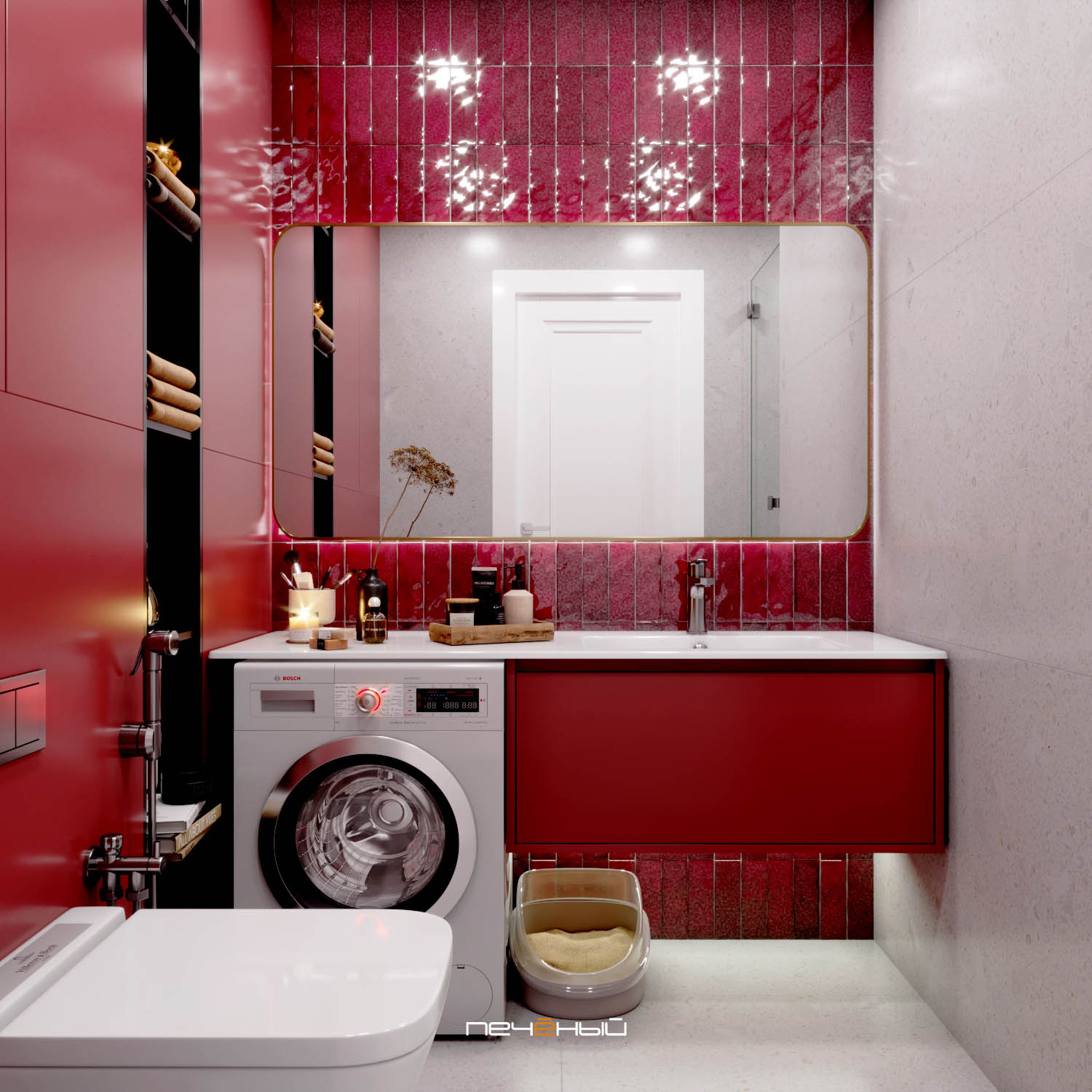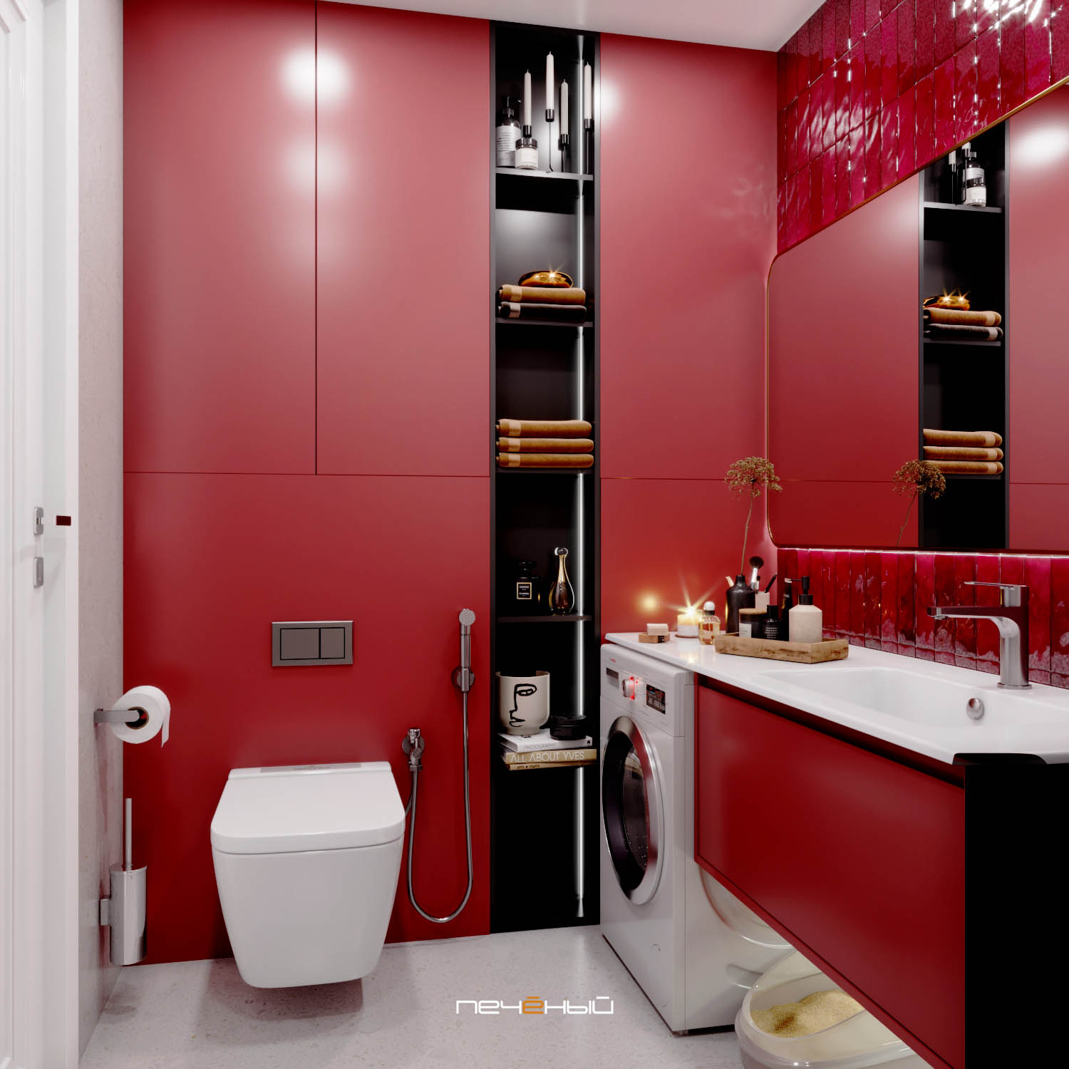 Согласитесь, что этот дизайн санузла в ярком красном оттенке — достаточно неожиданное и смелое решение! Подойдёт оно, решение, не всем. Но одно могу сказать точно: равнодушным такой санузел не оставит никого! 🙂