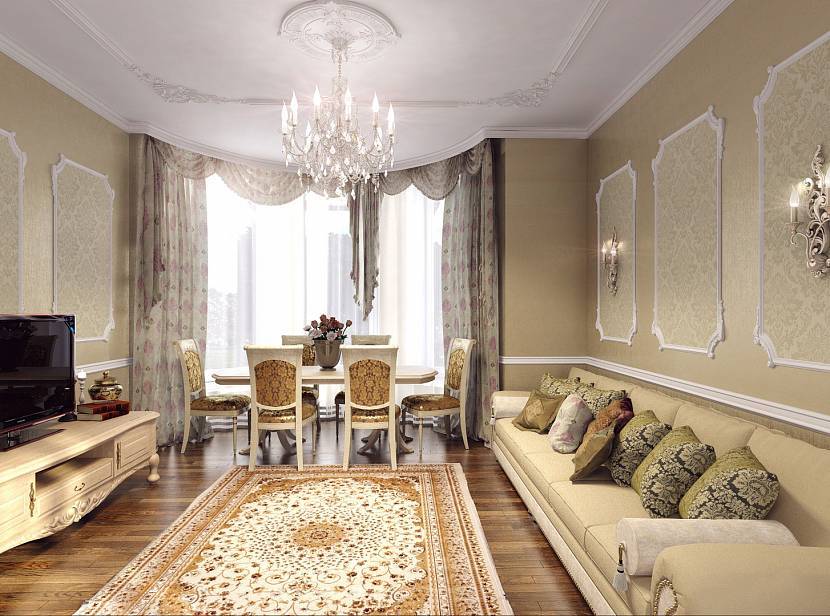 Классический стиль предполагает наличие росписи и лепнины на потолке и стенах, многоуровневые потолочные конструкции и колонны. Напольное покрытие создается из дорогой плитки, выполненной по традиционным технологиям, либо художественного паркета из дорогих древесных пород.