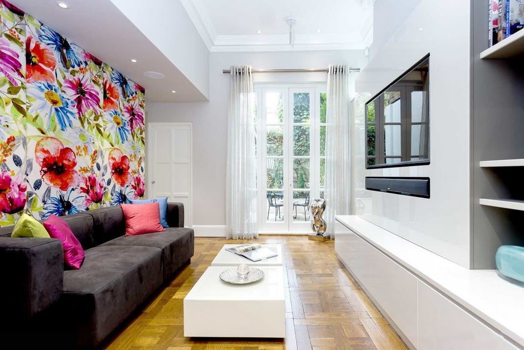 Оформление гостиной обоями может и изменять ее геометрию. Отличный пример — это фотообои. Панно с изображением открытого поля, пляжа, выхода в сад или в город, разрушают визуально границы комнаты. Порой такие вещи значительно сказываются на всей обстановке. Фото оформления гостиной с фотообоями показано ниже.