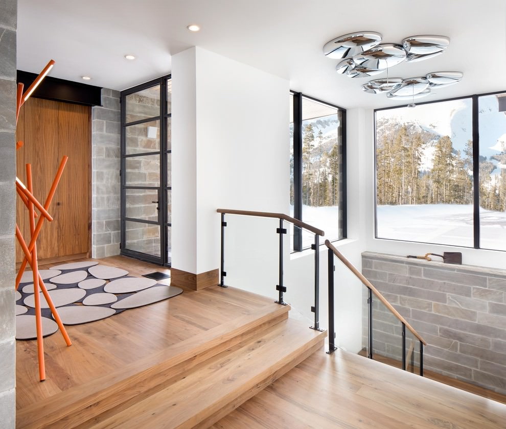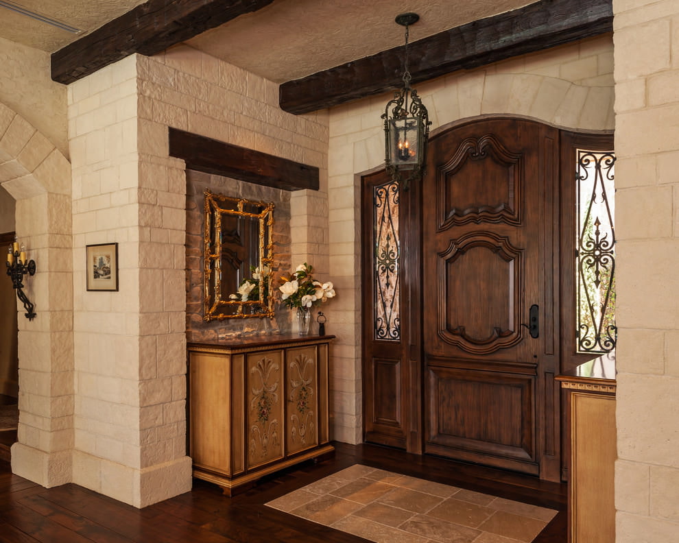 Другая распространенная фактура – песчаник. В отличие от сланца, более крупная и колоритная и далеко не всегда может вписаться в не самые просторные размеры городских прихожих. Зато в частных домах смотрится великолепно, выгодно подчеркивая внушительные масштабы помещения.