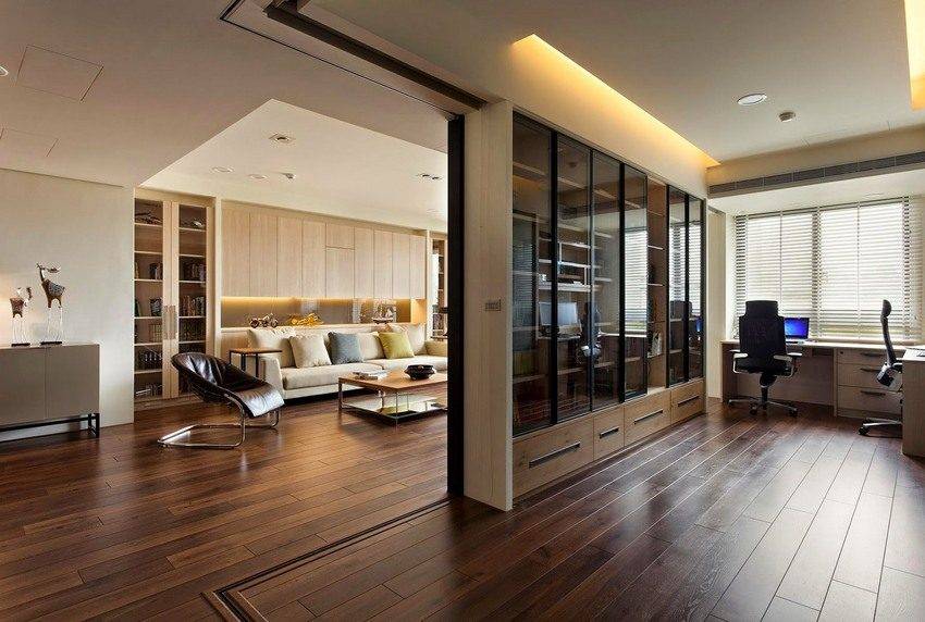В большинстве случаев установка перегородки требуется в гостиной комнате, если она совмещена со спальней хозяев или рабочим кабинетом.