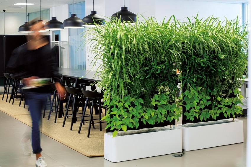 - Популярный эко-дизайн подразумевает использование натуральных материалов, поэтому в таких квартирах в роли перегородки могут выступать «живые стены». Здесь будет уместно использование высоких комнатных растений или же стеллажа, на котором размещены цветы.