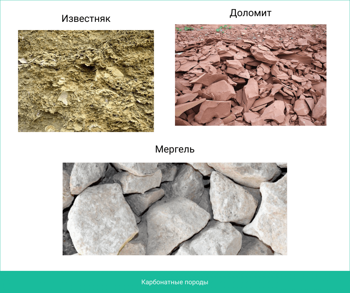- Карбонатные породы: доломит, мергель, ракушечник, мел и другие известняки.
