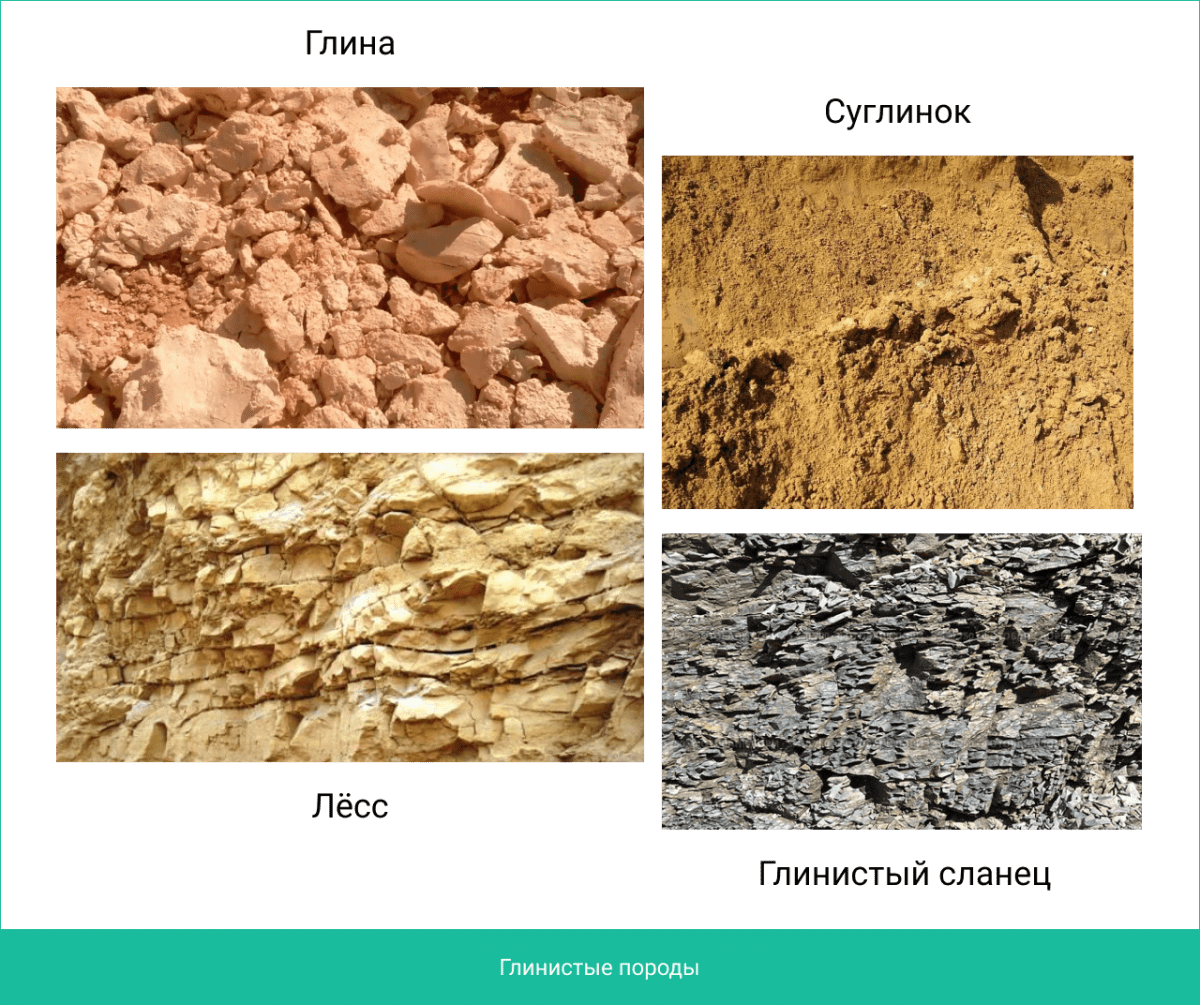 - Глина. Основная разновидность глинистых пород с минеральными включениями в составе.