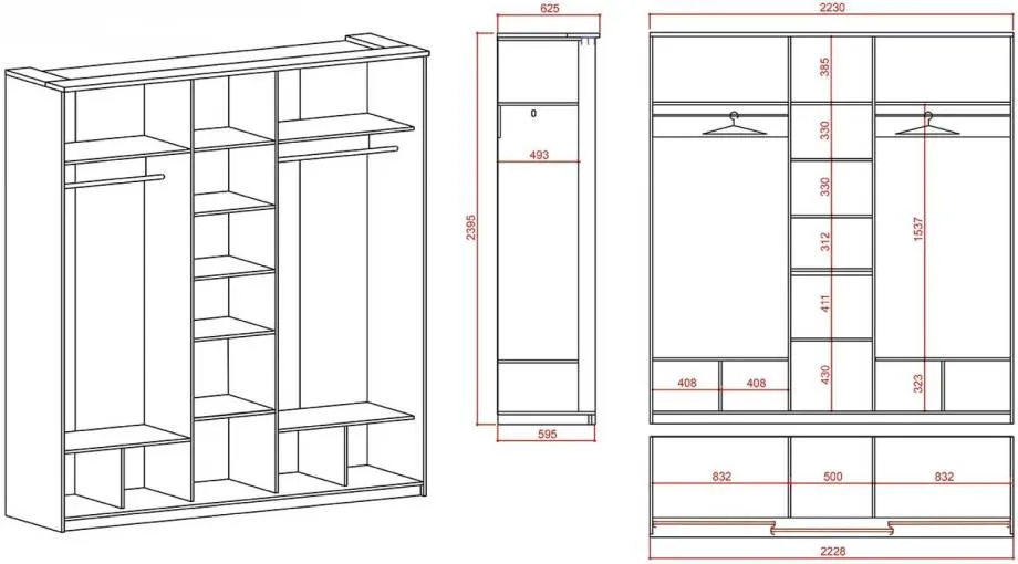 Варианты компоновки раздвижных дверей в шкафах купе.
