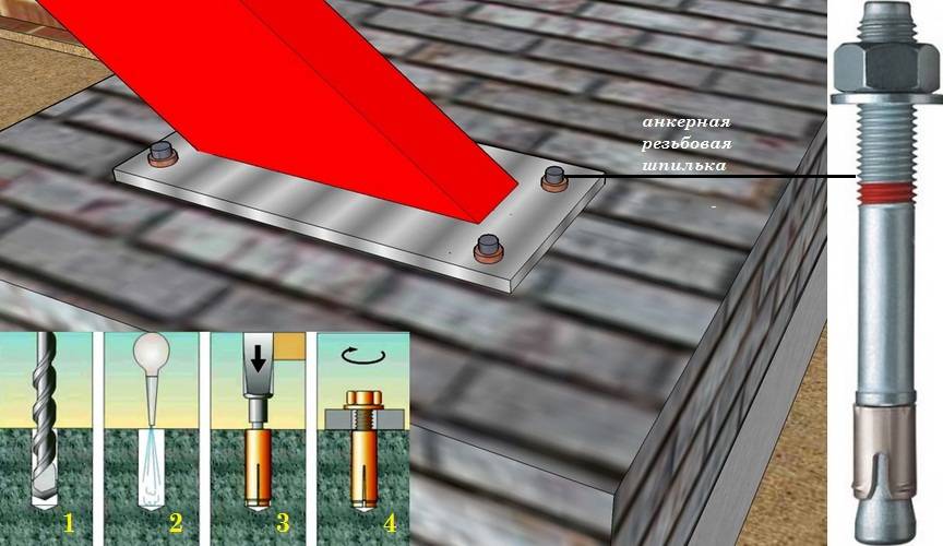 При установке нижнего лестничного марша на фундамент из монолитного бетона, можно использовать обычные резьбовые шпильки.