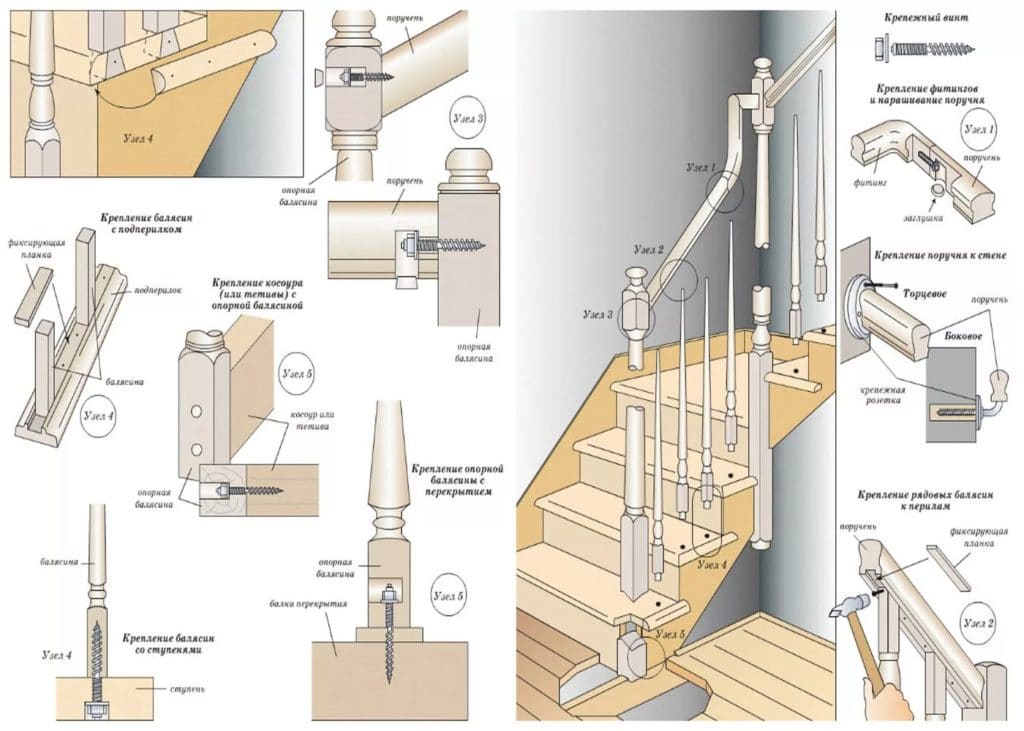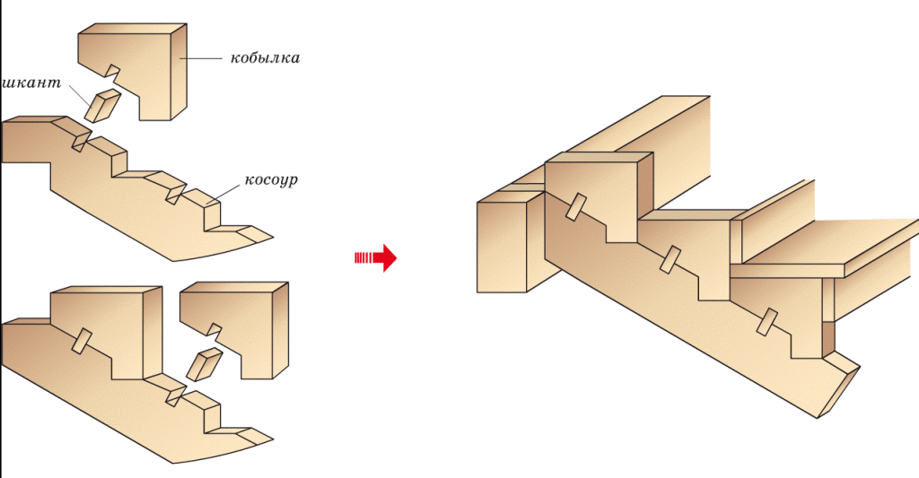 Монтаж лестницы осуществляется в следующем порядке: косоуры, подступенники, поступи, балясины, перила и поручни.