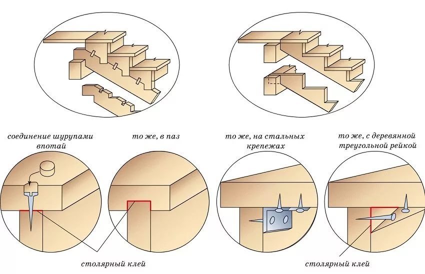 Деревянная лестница в частных домах собирается по типу обыкновенного детского конструктора. Во всех элементах делаются специальные пазы, которые обеспечат устойчивость и надёжность всей конструкции. Но недостаточно вставит несколько элементов лестницы друг в друга, их также необходимо скрепить с помощью гвоздей или простых саморезов.