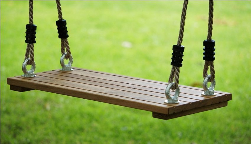 Качели из доски (спила бревна, деревянной решетки и т.п.) и канатов – классика. Достаточно сделать 4 отверстия по углам широкой доски и вдеть веревки.