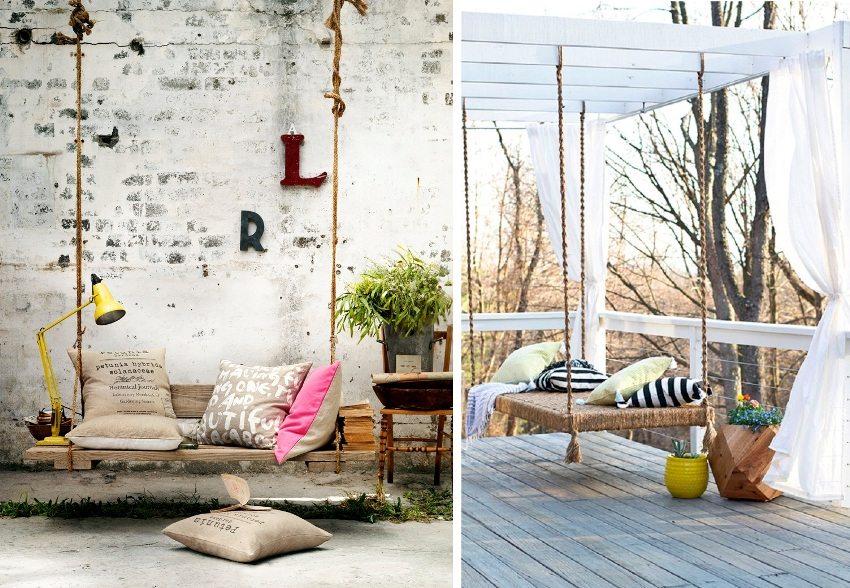 Для большего комфорта можно положить на скамью подушки или небольшой матрас, позволяющий снизить жесткость посадки. Его размер должен соответствовать размеру сидения. Тому, кто знаком с технологией выполнения мягкой обивки для мебели, можно посоветовать применить эти навыки при создании качелей. Сделайте мягким не только сидение, но и спинку, а также подлокотники, если они присутствуют в вашей конструкции. Не стоит забывать, что выполнение мягкой обивки возможно только в том случае, если изделие располагается под крышей или навесом.
