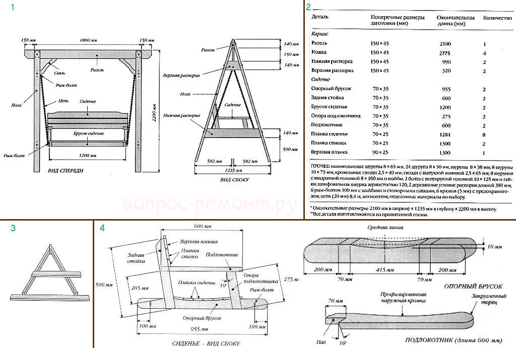 От размеров и грузоподъемности посадочного места зависят конструкция стоек, размеры качелей и способ соединения элементов. Поэтому начинать проектирование надо с него.