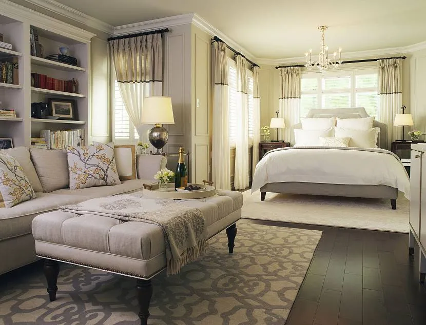 Если место позволяет, то обычно кровать ставят по центру комнаты, а остальную мебель уже расставляют вокруг нее. Также руководствуются положением кровати и в расстановке предметов декора и различных украшений.