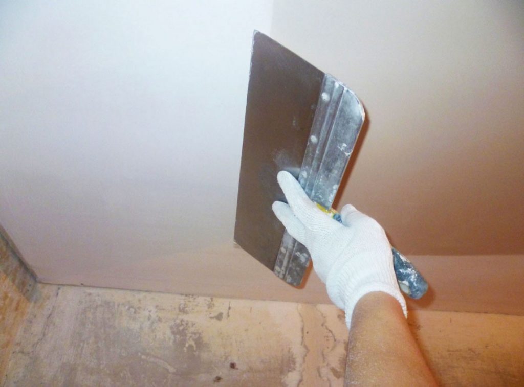 Делать это следует быстро, так как зашпаклевать потолок нужно сразу, одним разом, чтобы не было трещин.