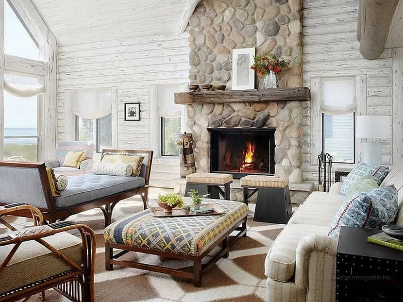 Вымощенный речной галькой пол или эффектное панно от пола до потолка в каминном зале, отделка кухонного фартука или стены в районе умывальника придадут вашему дачному интерьеру особый колорит и чувство глубокого удовлетворения от творческого процесса.